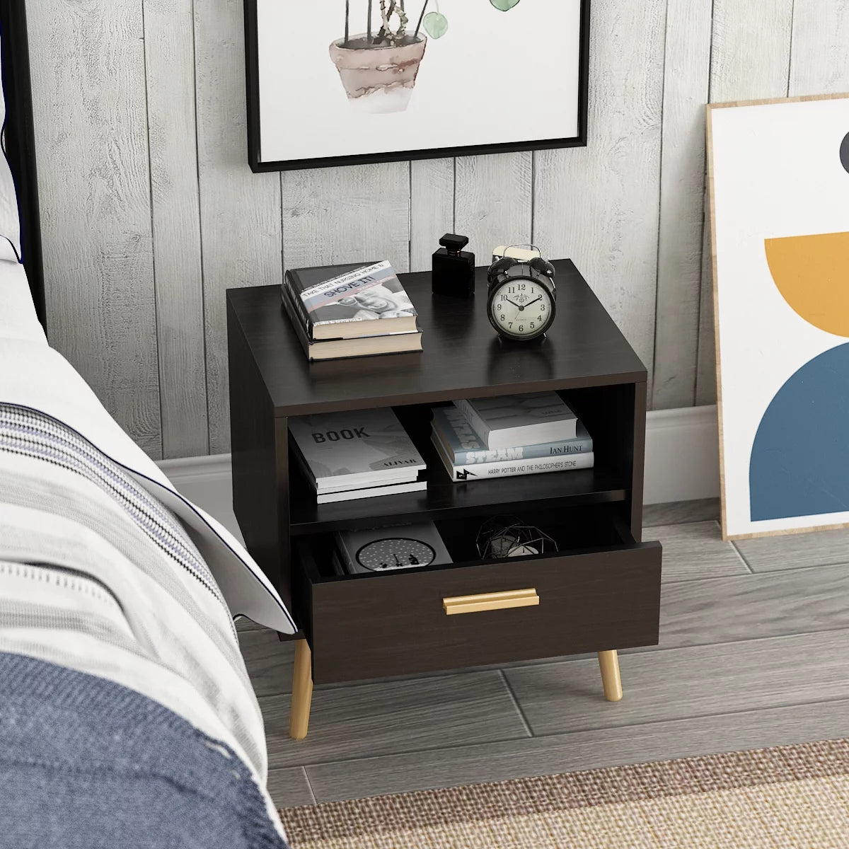 Black Small Side Tables for Bedroom Modern Mid Century Nightstand with Drawer