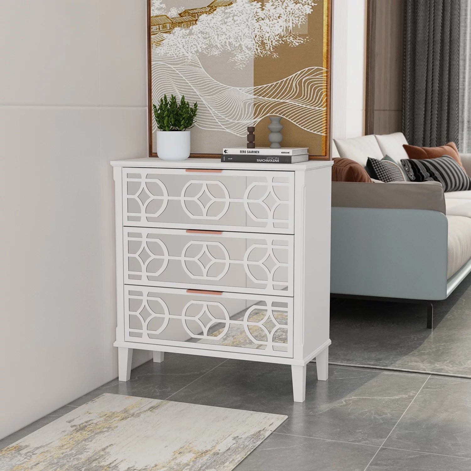 - Stylish Design: Featuring an eye-catching front-facing silhouette with geometric patterning and a decorative mirror, this cabinet affords a chic modern appearance for your home. The silver metal handy knobs, white tone and the vintage-inspired surface blends together to bring a unique charm. This cabinet works well as a console table, entrance hall table or a sofa-side table, creating your own personal style effortlessly.