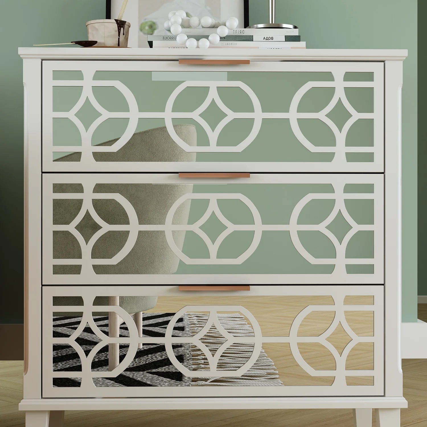 A unique mix of rustic and glam makes the 3 drawer french country nightstand a chic bedside companion. This wood nightstand displays a white finish for an aged, vintage look. Three drawers provide ample space to store all the bedroom essentials.The rectangular top surface is perfect to display a lovely floral arrangement, lamp, or family photos.Mirrored glass adds a hint of glamour and highlights the elegant unique pattern layover. This unique luxe mirrored side table enhances the surrounding decor with innovative mirrored panels on drawers.This combination of practical and ornamental design create a beautiful Console Table that will complement any living room, dining room or hallway.