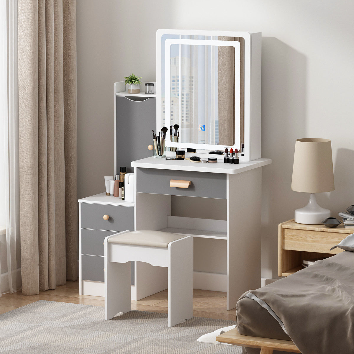 Vanity Set with Mirror and Lights Modern Storage Makeup Dressing Table with 5 Drawers Gray