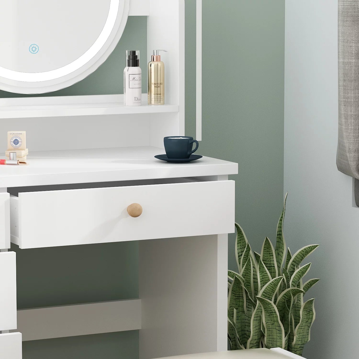 - Adequate storage capacity: Drawers and shelves on the desktop provide you with plenty of storage space. The large storage space allows you to put all your skin care products, cosmetics, jewelry and other beauty supplies