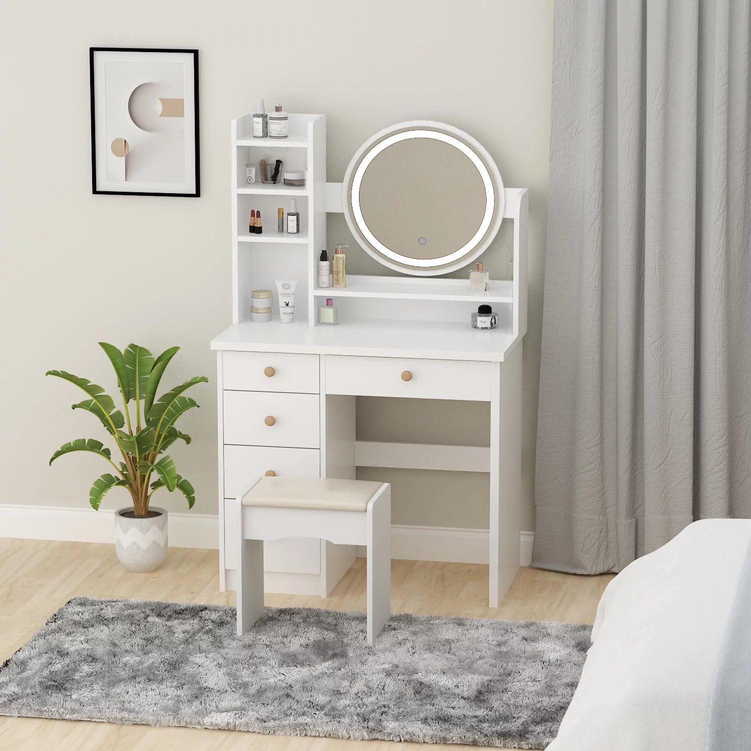 Vanity Set with Mirror and Lights Modern Storage Makeup Dressing Table with 5 Drawers White
