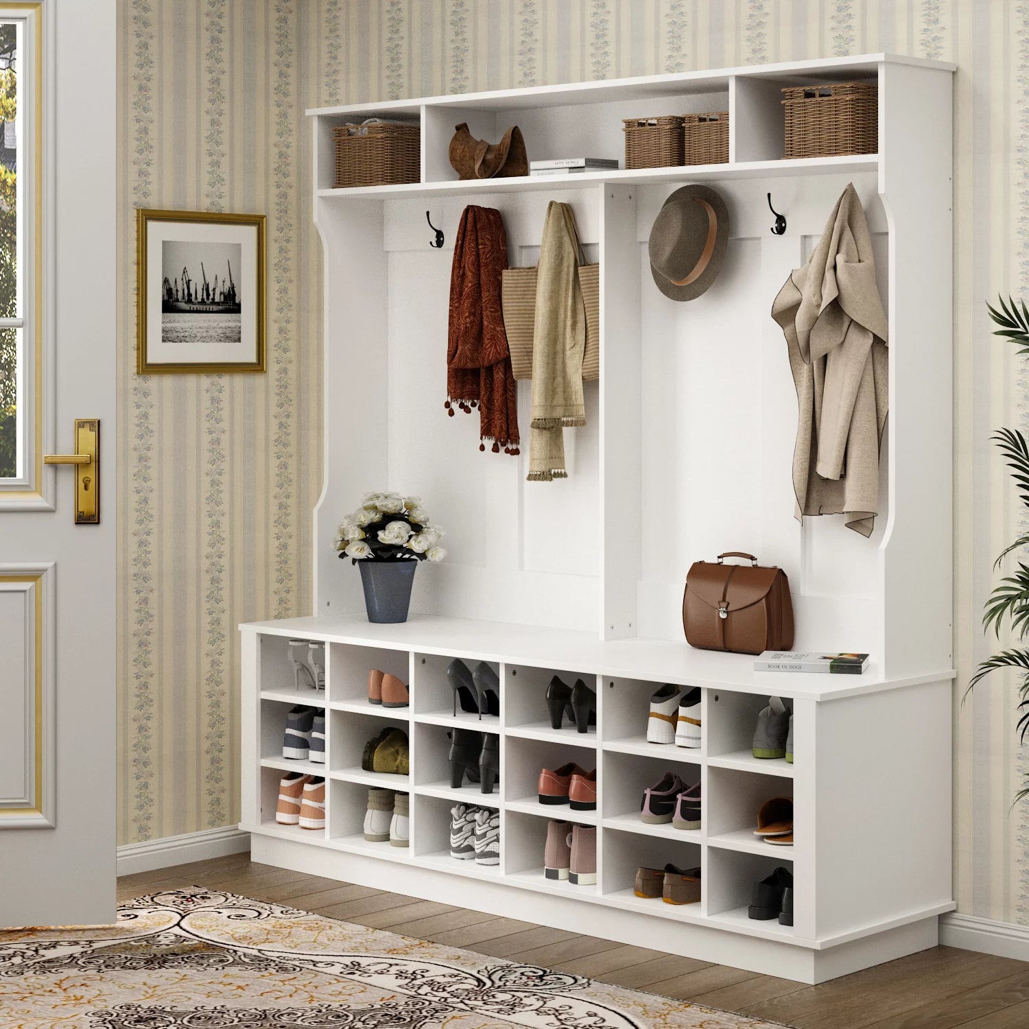 Organize and style your entryway with the Wide HALL Tree. Standing at 66.9" Tall and 63" Wide, This hall tree will provide all the storage space needed for your entryway belongings. Store your larger items in the 3 upper compartments, and hang your jackets, scarves, purses and hats on the 6 strong double coat Hooks. A wide bench, with plenty of room, sits on top of 18 individual shoe cubbies. Each shoe cubby is spacious enough to hold a pair Men's shoes, keeping them neatly stored and out of the way. The white hall tree’s sleek design fits in with all decors and provides the essential storage space you need.