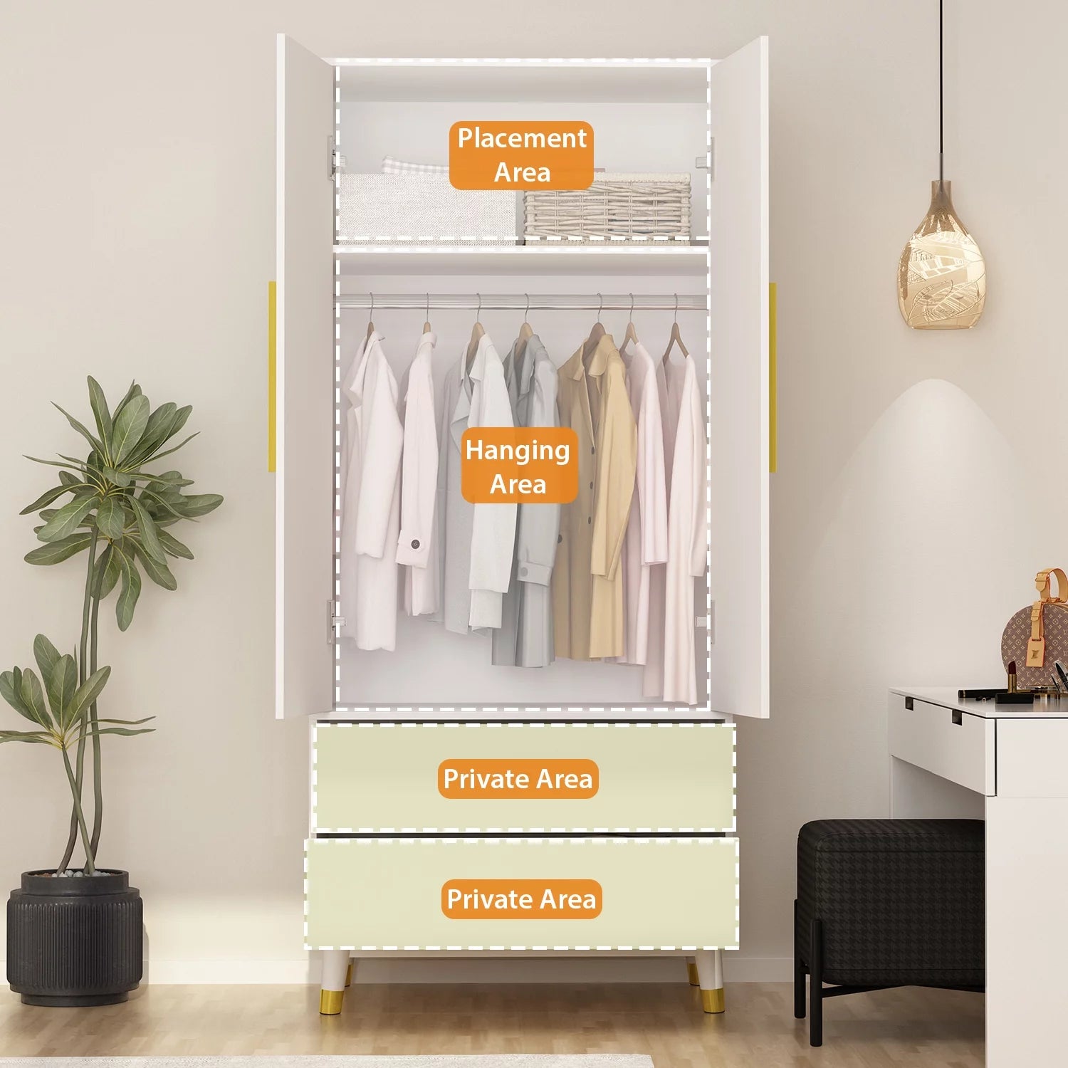 WIAWG 2 Door Wardrobe Storage Cabinet, 71" H Wooden Armoire with Drawers and Hanging Rod for Bedroom, White