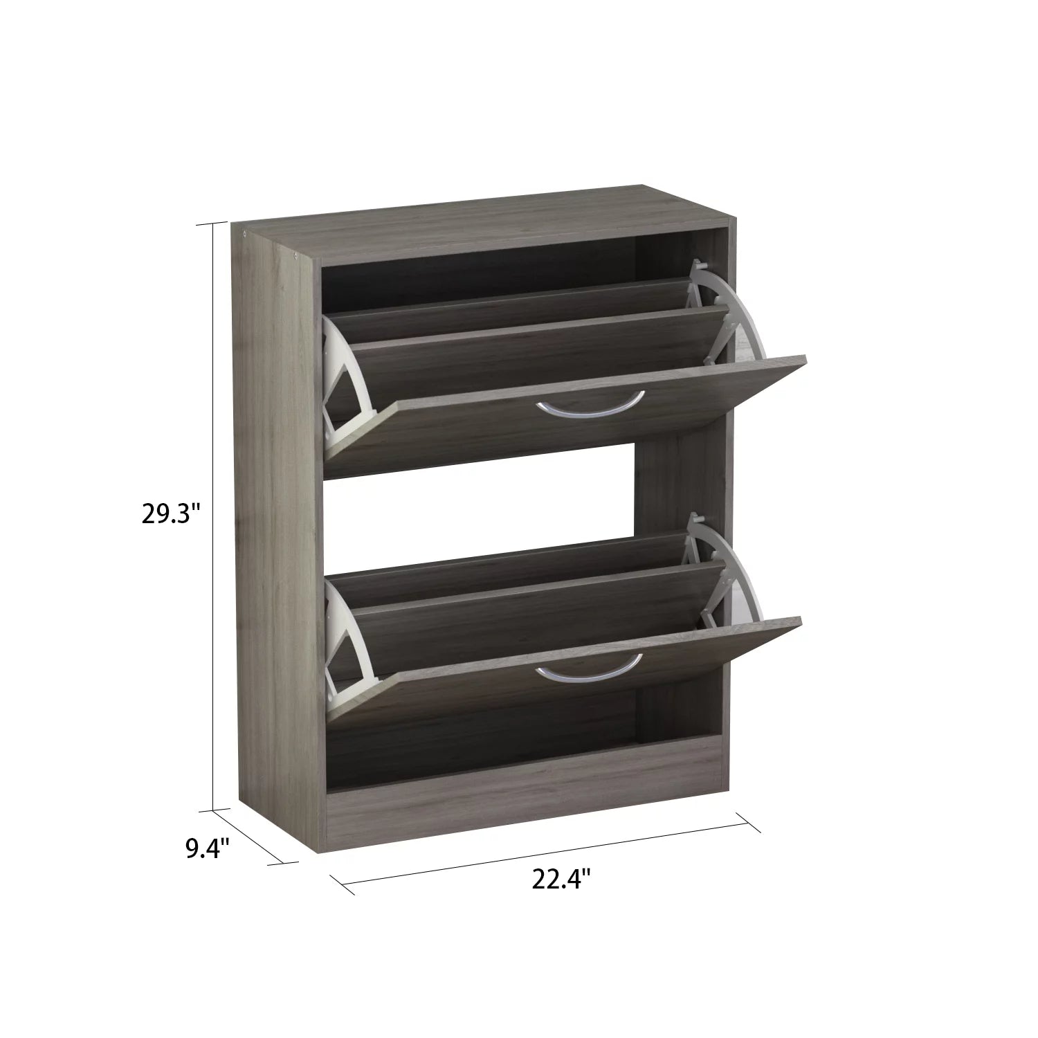 Stash your shoes stylishly in our Shoe Cabinet. This modern shoe storage solution was designed with a low profile, svelte size as to fit neatly against a wall in a hallway, mud room, or entryway. Two storage compartments each fit six pairs of shoes comfortably for a total of approximately eighteen shoe slots, which varies depending upon your shoes’ sizes. The unit is PB frame, faux gray grain paper veneer finish, and silver handles. Perfect for your entrance or bedroom for keeping sneakers, heels, and flats under wraps. Update your everyday organization with the smart design and spacious drawers of the rustic gray shoe cabinet.