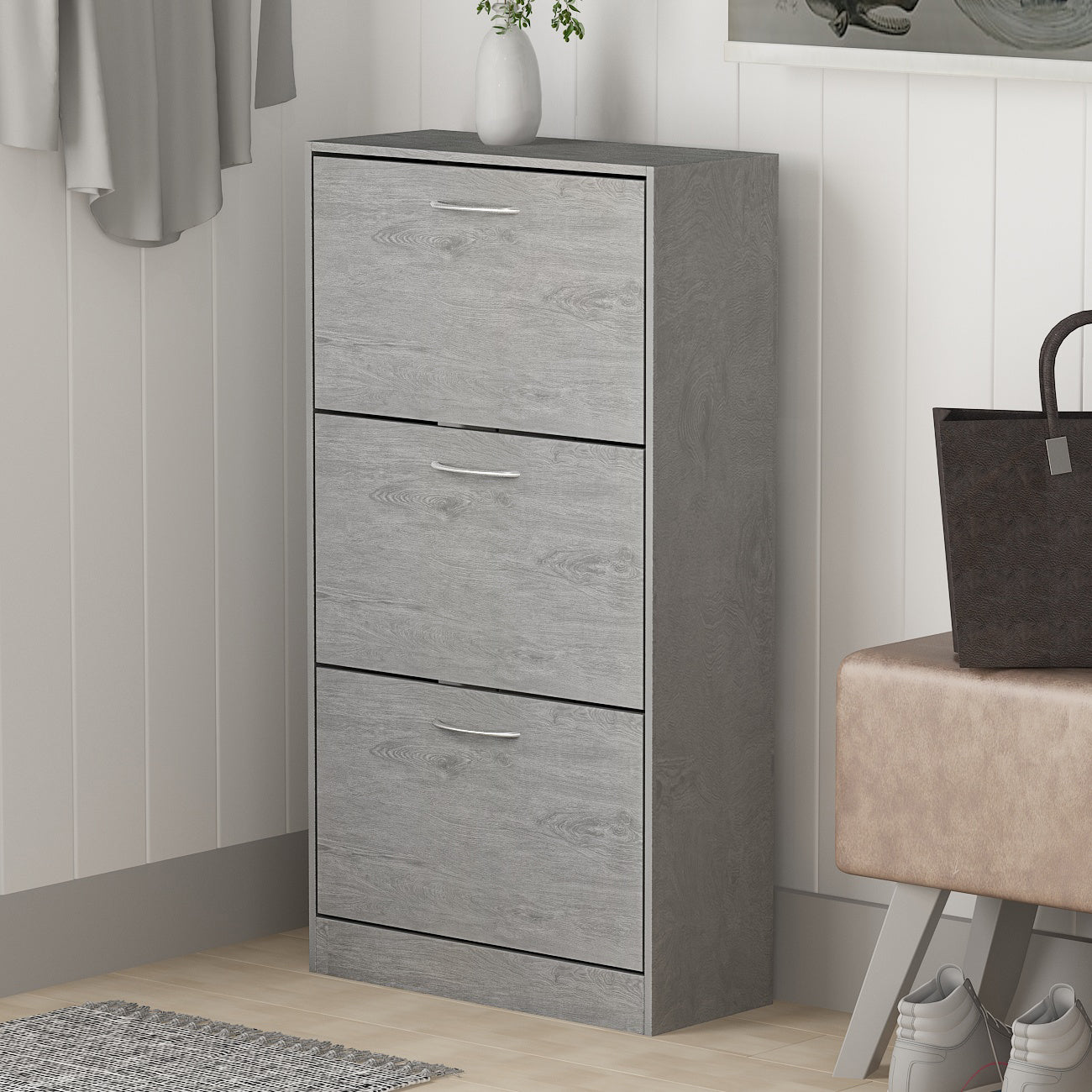 Stash your shoes stylishly in our Shoe Cabinet. This modern shoe storage solution was designed with a low profile, svelte size as to fit neatly against a wall in a hallway, mud room, or entryway. Three storage compartments each fit six pairs of shoes comfortably for a total of approximately 24 shoes, which varies depending upon your shoes’ sizes. The unit is PB frame, faux gray grain paper veneer finish, and silver handles. Perfect for your entrance or bedroom for keeping sneakers, heels, and flats under wraps. Update your everyday organization with the smart design and spacious drawers of the rustic gray shoe cabinet.