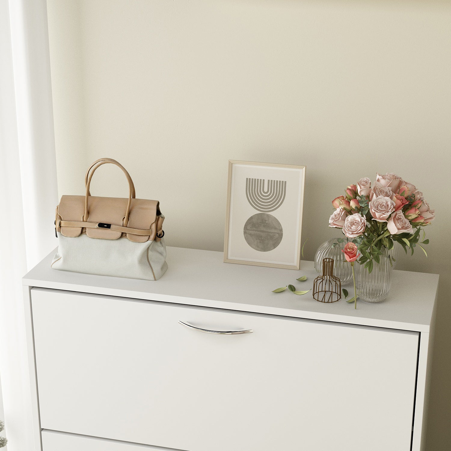A shoe cabinet is an indispensable piece of furniture in every home, and the three-tier flip-out drawer provides huge storage capacity while avoiding unpleasant odors, which greatly improves the cleanliness of your home. You can store and display keys, photo albums and plants on the countertop. Made of high-quality MDF wood, this shoe cabinet is not only elegant but also durable. The white finish of the shoe storage space complements any interior style. The modern freestanding shoe cabinet measures 31.6''W x 9.3''D x 42.6''H, the space saving design and powerful storage capacity are enough to keep the home organized, ideal for small apartments or small space. The wood shoe organizer will be placed in entryways, hallways, offices, dorm rooms, dance studios, or bedrooms.