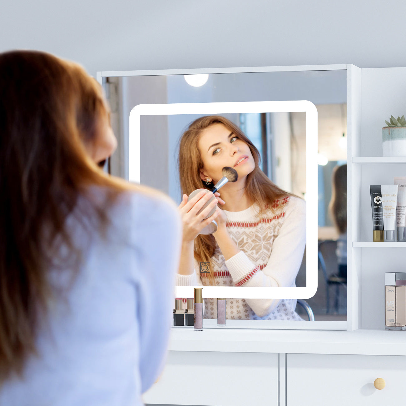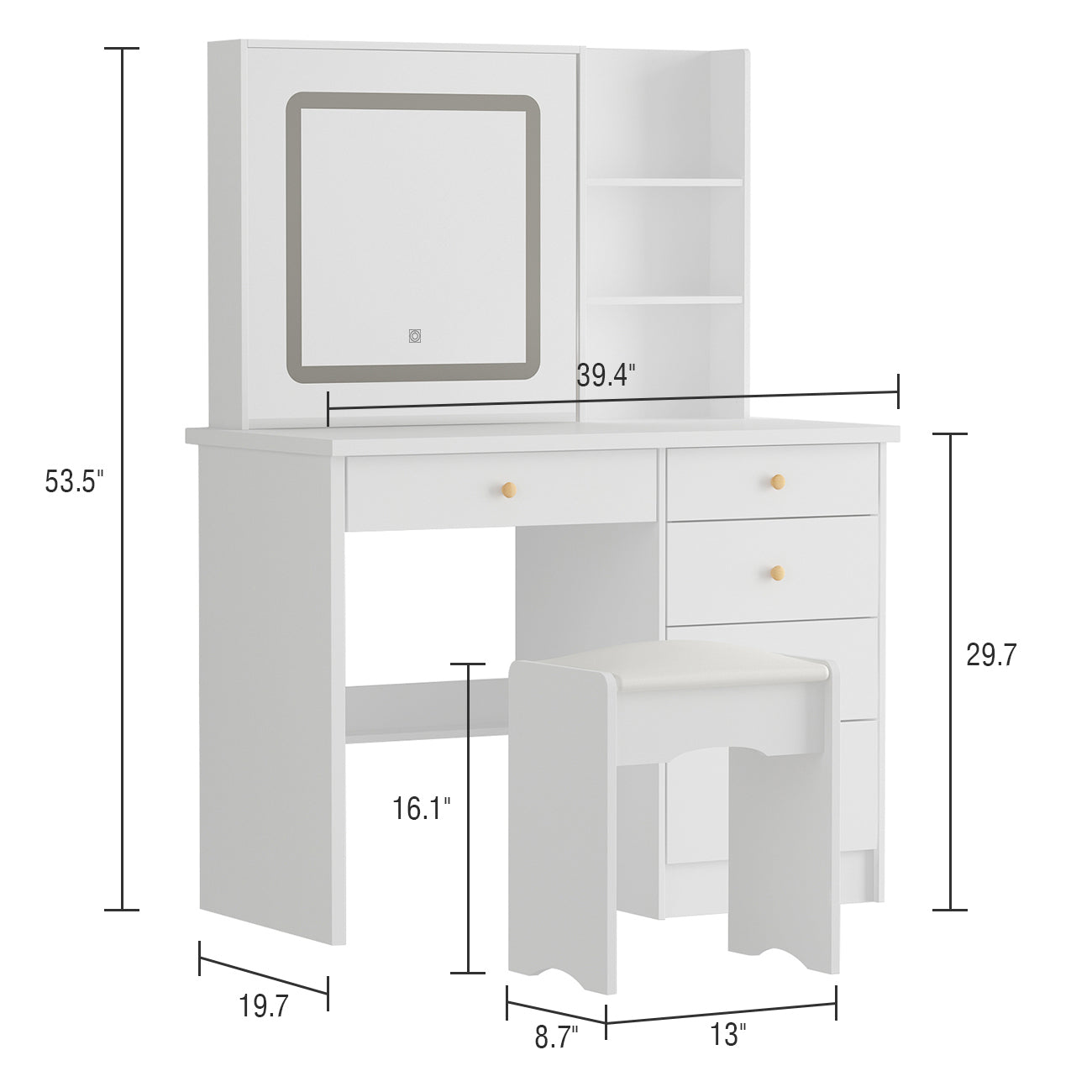 Our vanity table set adheres to the minimalist design concept, blending well with your modern room. Covered with safe paint, the smooth surface is easy to clean, allowing you to enjoy an elegant while neat dressing area. Five storage drawers are designed into different size considerate for easy organization. Large drawer with dividers is available for makeup tools, such as hair dryer, hair curler, combs and so on. The open shelves are perfect for your skin care products, cosmetics or jewelries.