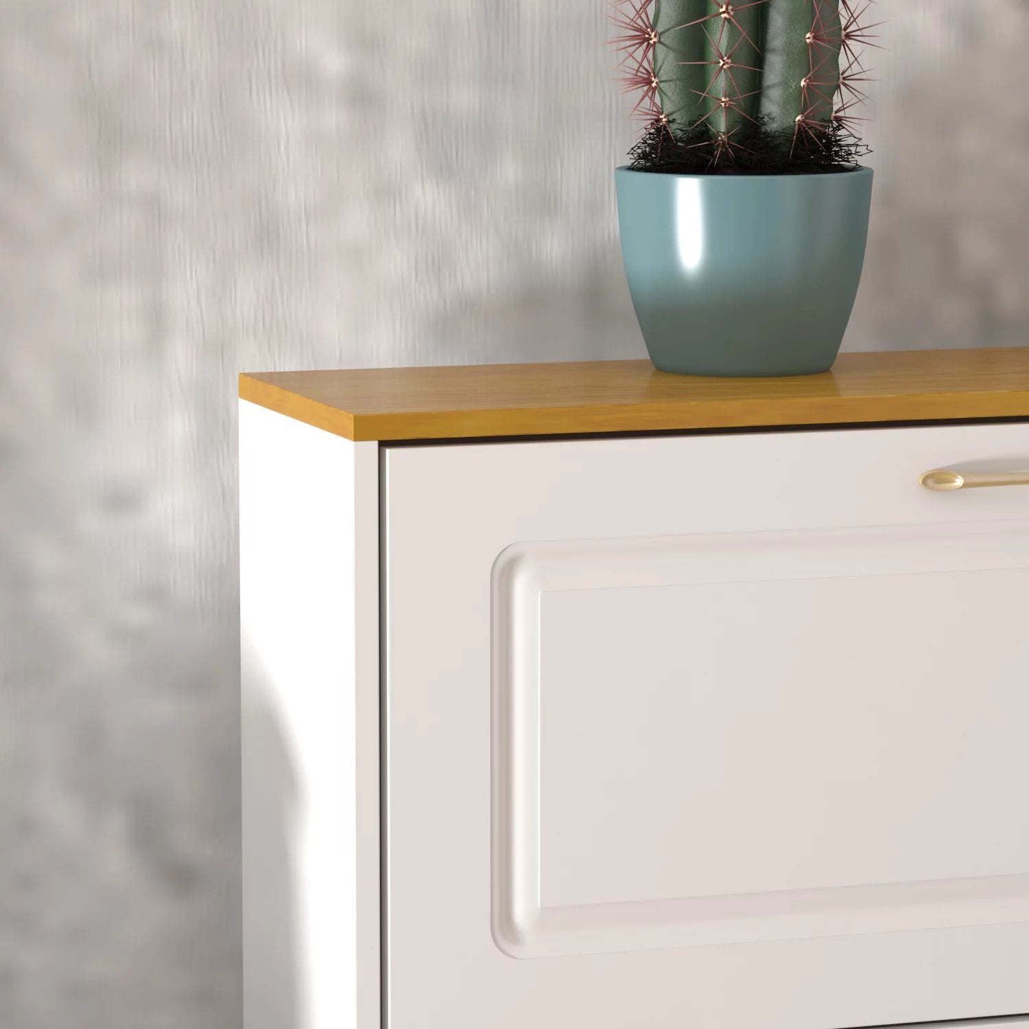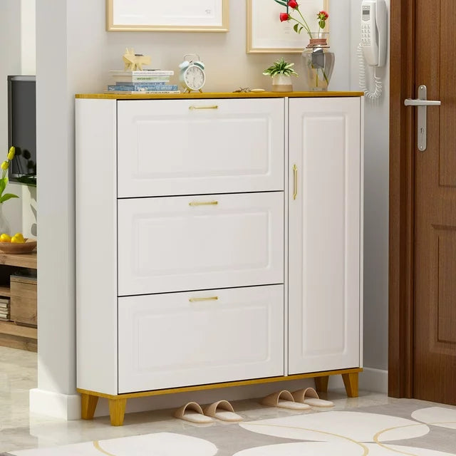 The solution to stylish shoe organization lies within the shoe cabinet. This cabinet was designed with a low profile to fit neatly against a wall in a hallway, mudroom, or entryway. Three fold-out storage compartments provide space to place up to 30 pairs of shoes. Solid wood legs add refined style and provide elevation to deter dust buildup. Features three pull-down drawers with two sections each on the left. Large compartment with two divided compartments on the right, ideal for boots. Maybe you can store your umbrella in the cabinet on the right because it's high enough to hold your umbrella and boots. The base made of solid wood makes the shoe cabinet have super bearing capacity and durable.