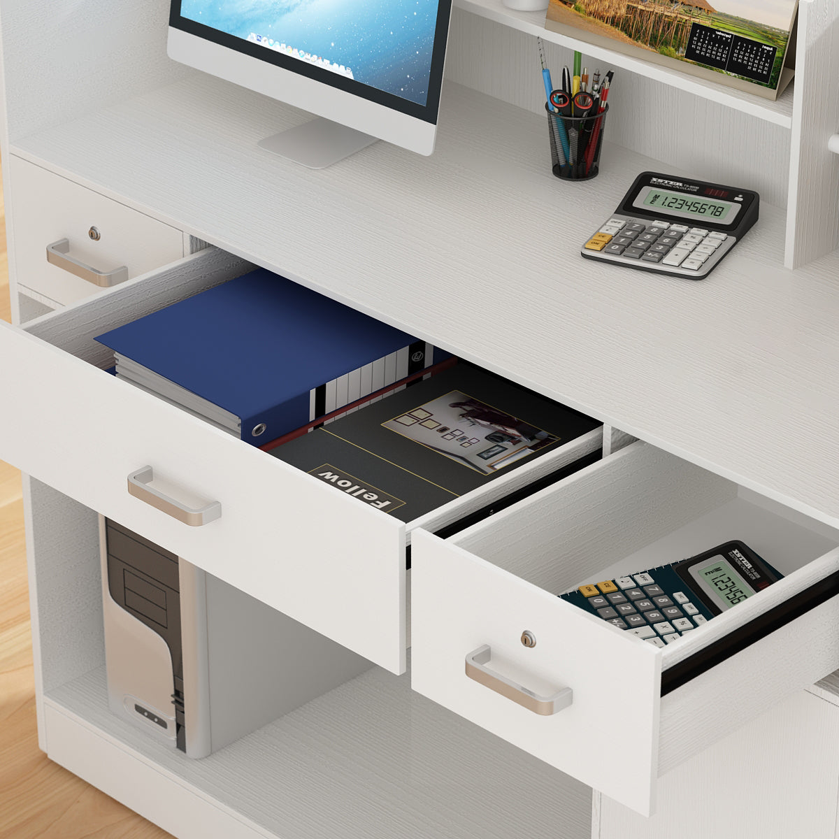 - Two storage pedestals with locking drawers and a cabinet allow for convenient storage of files, documents, and other vital office tools, implements, and resources.