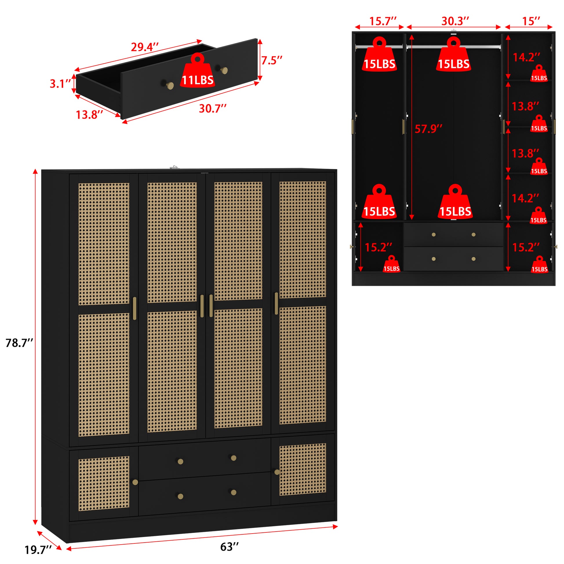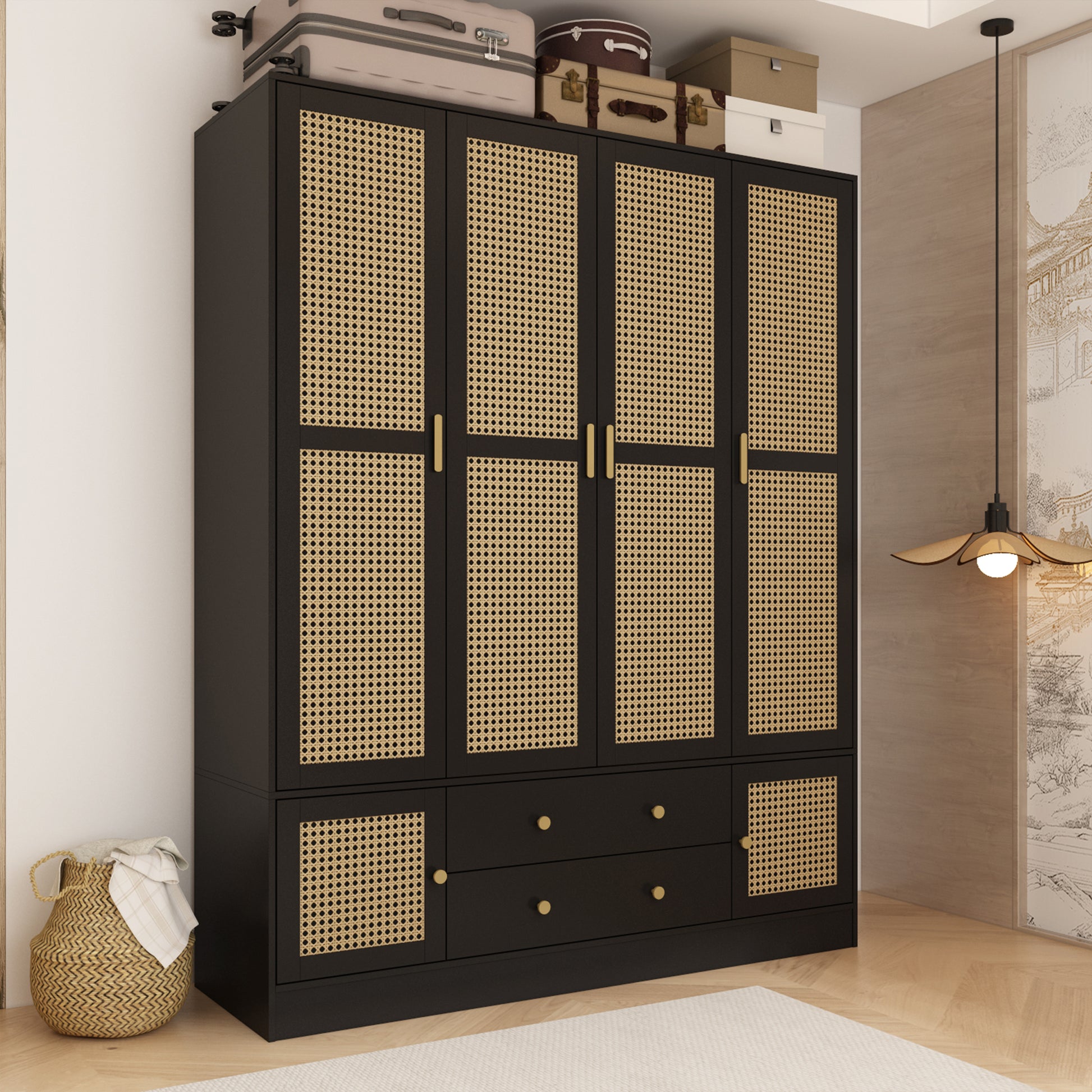WIAWG 6-Doors Wardrobe with Rattan Accents ,2 Big Drawers Extra Storage Space For Bedroom,Black