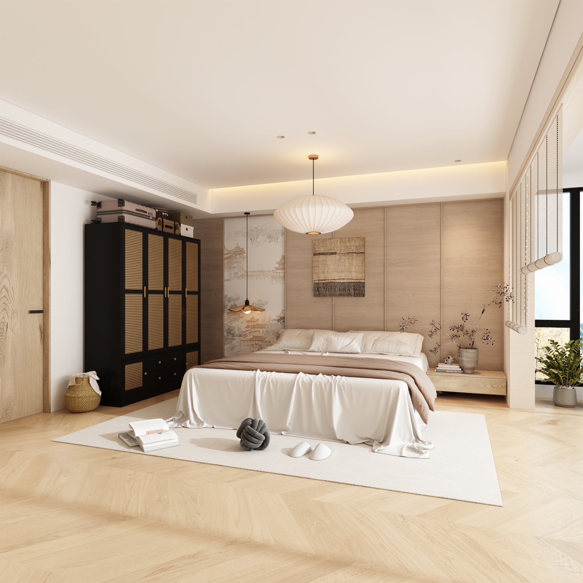 Multi-functional Design: The middle doors and the left-side door open to reveal spacious hanging areas for your clothing, while the right-side door features multiple shelves for neatly organizing your items, making it an ideal closet system with doors.Convenient Lower Compartments: The bottom left compartment offers additional storage space, and the two lower drawers are perfect for stowing away miscellaneous items.Elegant and Durable: Crafted from durable PB board and adorned with exquisite rattan weaving, this wardrobe is both practical and visually appealing, serving as a perfect bedroom armoire.Easy Assembly: Simple assembly required, with all necessary accessories and instructions included, making it easy to set up your new rattan armoire.
