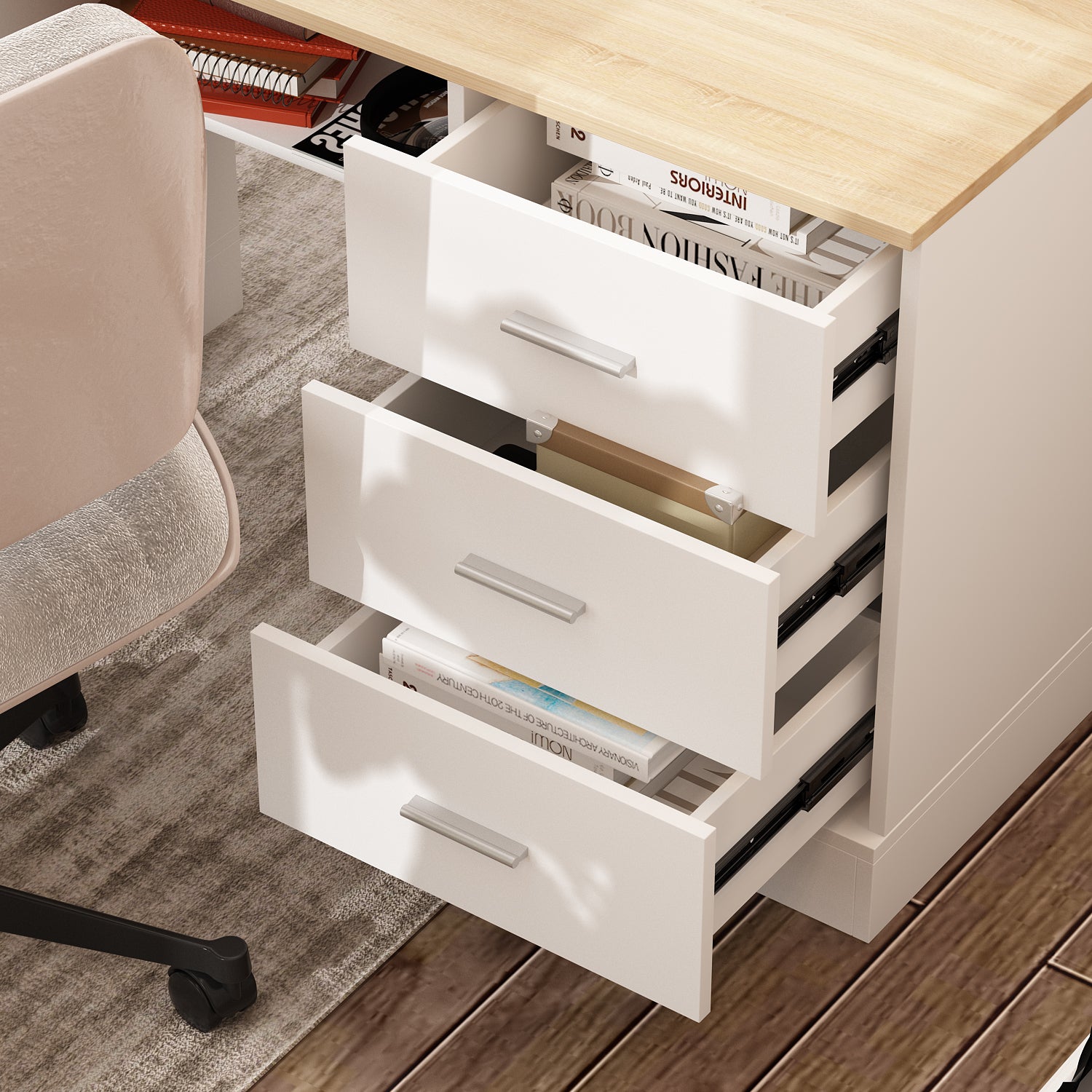 - Customize your desk with 1-3 memory settings for quick height adjustments, and enjoy ample workspace with the large 63-inch top and a cabinet (25.2" height) that offers room for computers, printers, files, and more, plus added side shelves to keep books and supplies within reach.