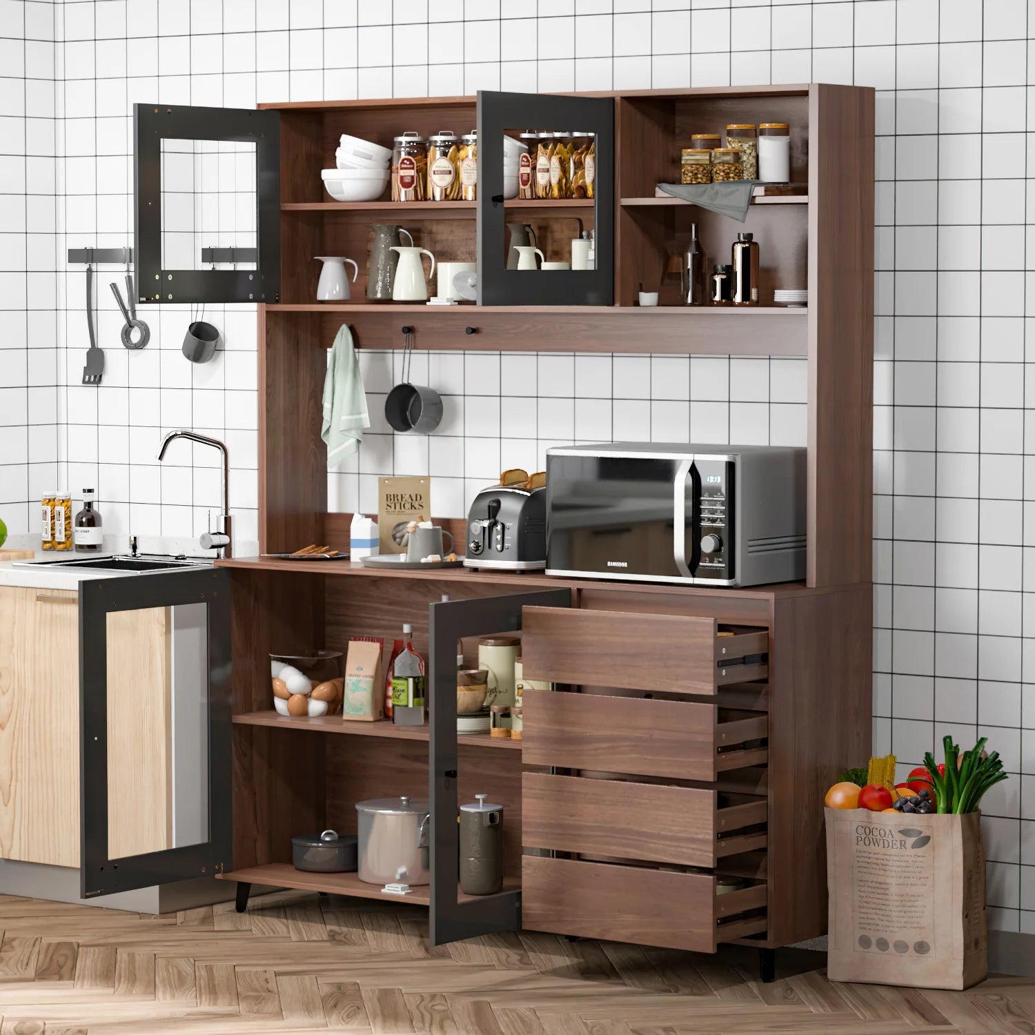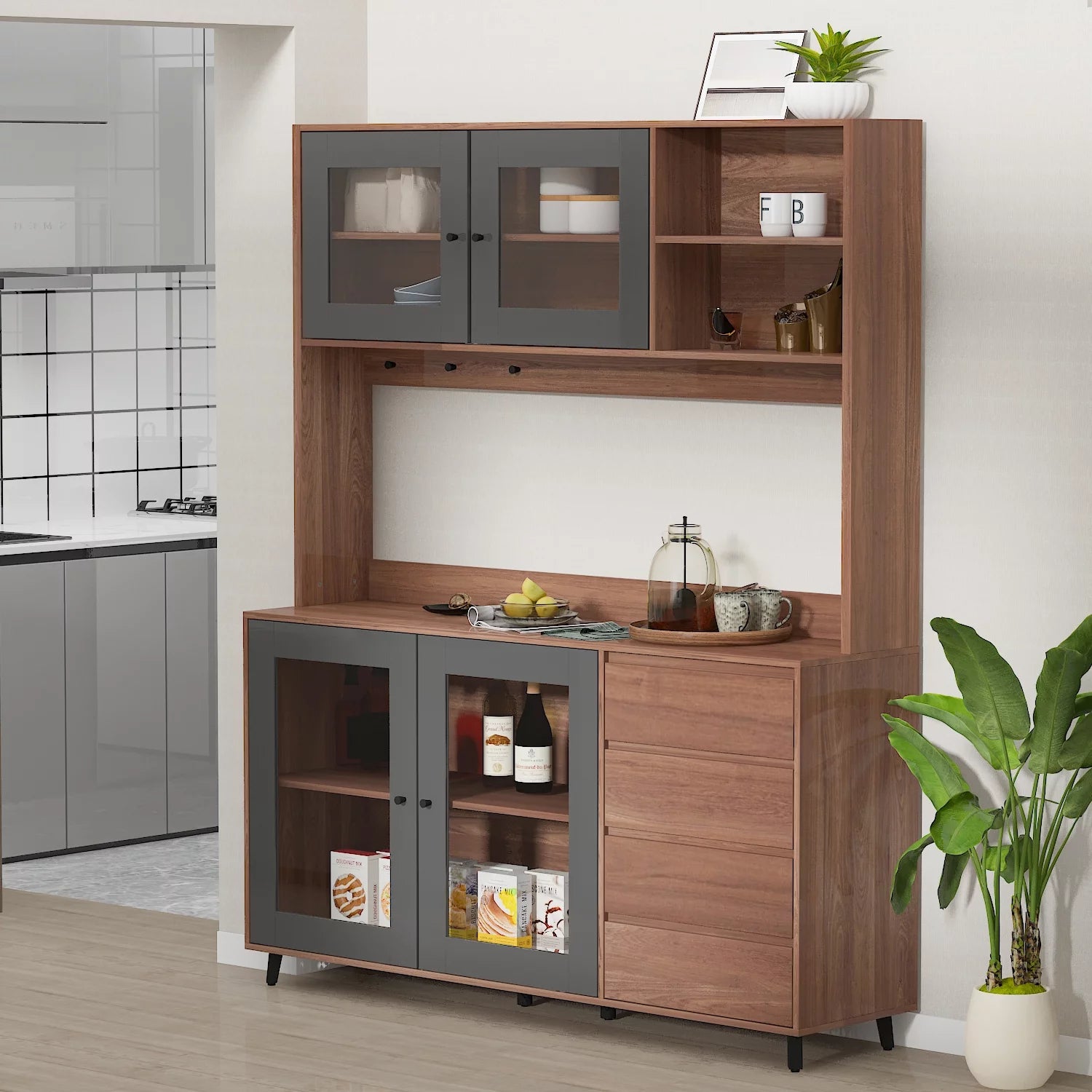 WIAWG 63" Modern Kitchen Pantry Storage Cabinet Large Wooden Sideboard Buffet hutch Cupboard Walnut/Black