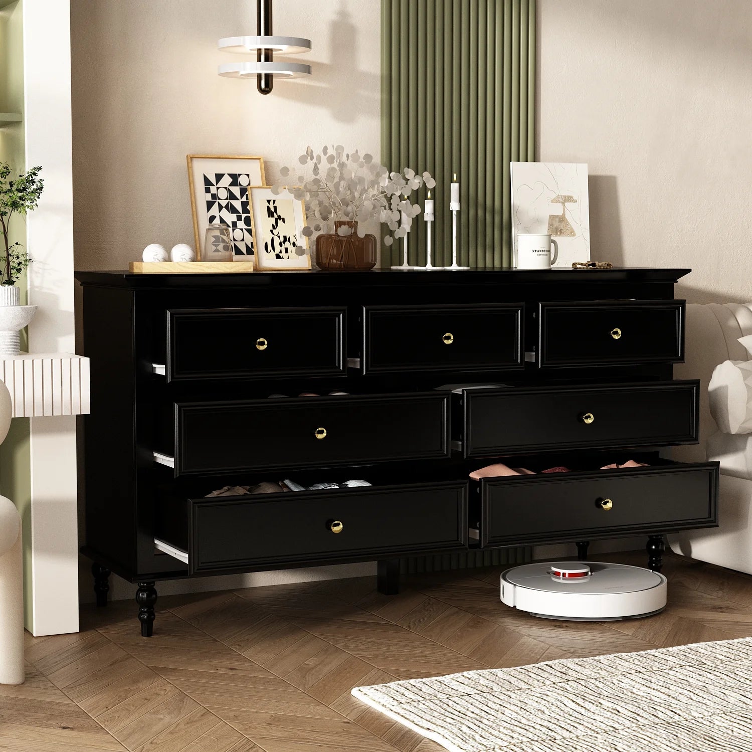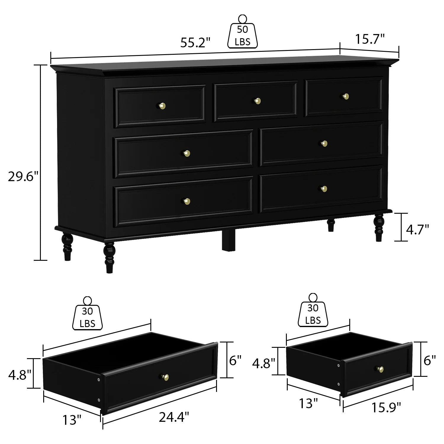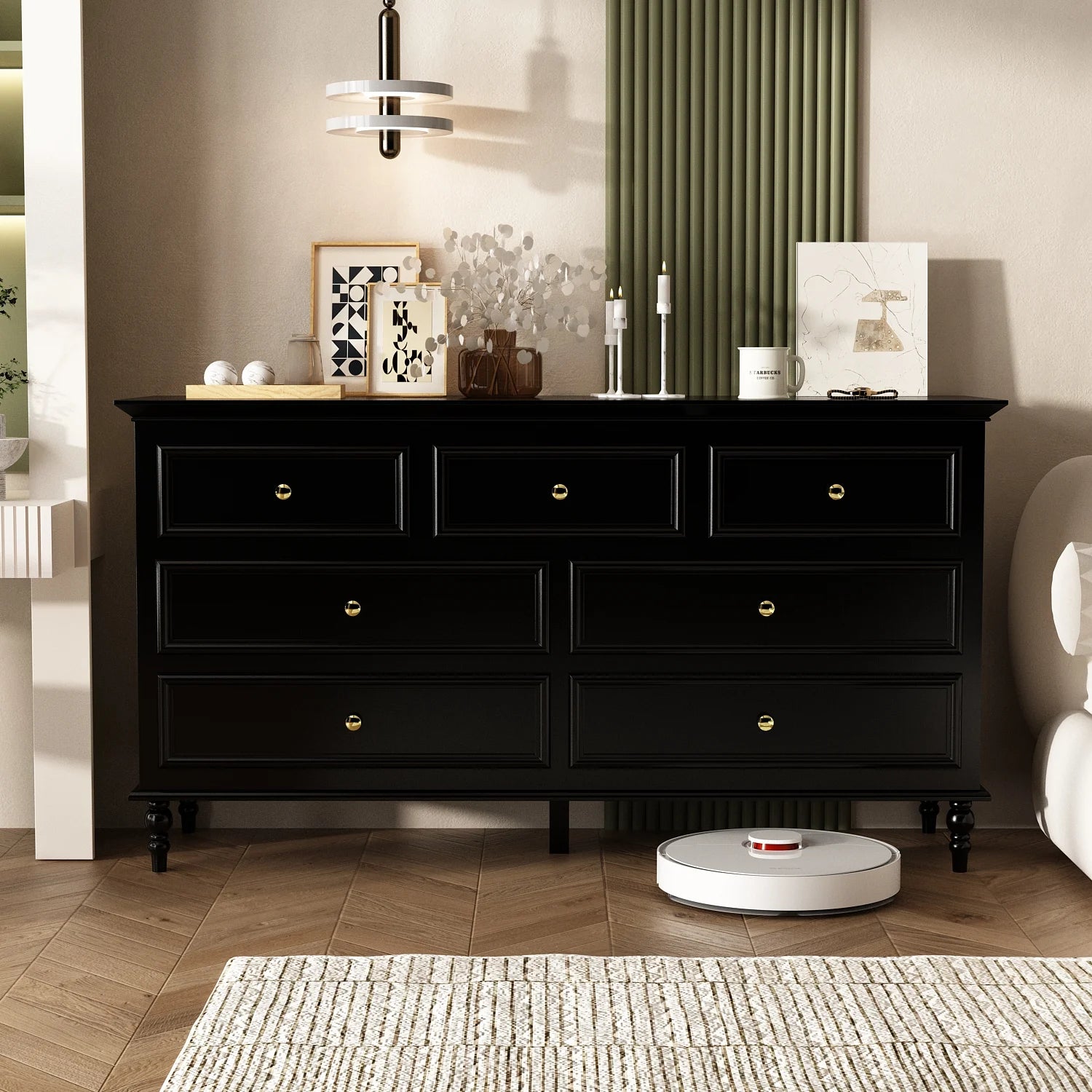 This 7 Drawer Dresser is crafted from MDF board that's finished with a black finish. This 7 drawer dresser is sizeable and wide, it has plenty of space for storage.One cool nickel pulls on each drawer help complement the black exterior on this modern classic and make it easier and more convenient. Special shape feet are designed to serve and support.It features 7 spacious drawers that open smoothly, revealing ample space to tuck away shirts, pants, and other wardrobe must-haves. It can not only as a dresser, but also can be your TV stand.This classic design and bold style add a special feature in your bedroom.