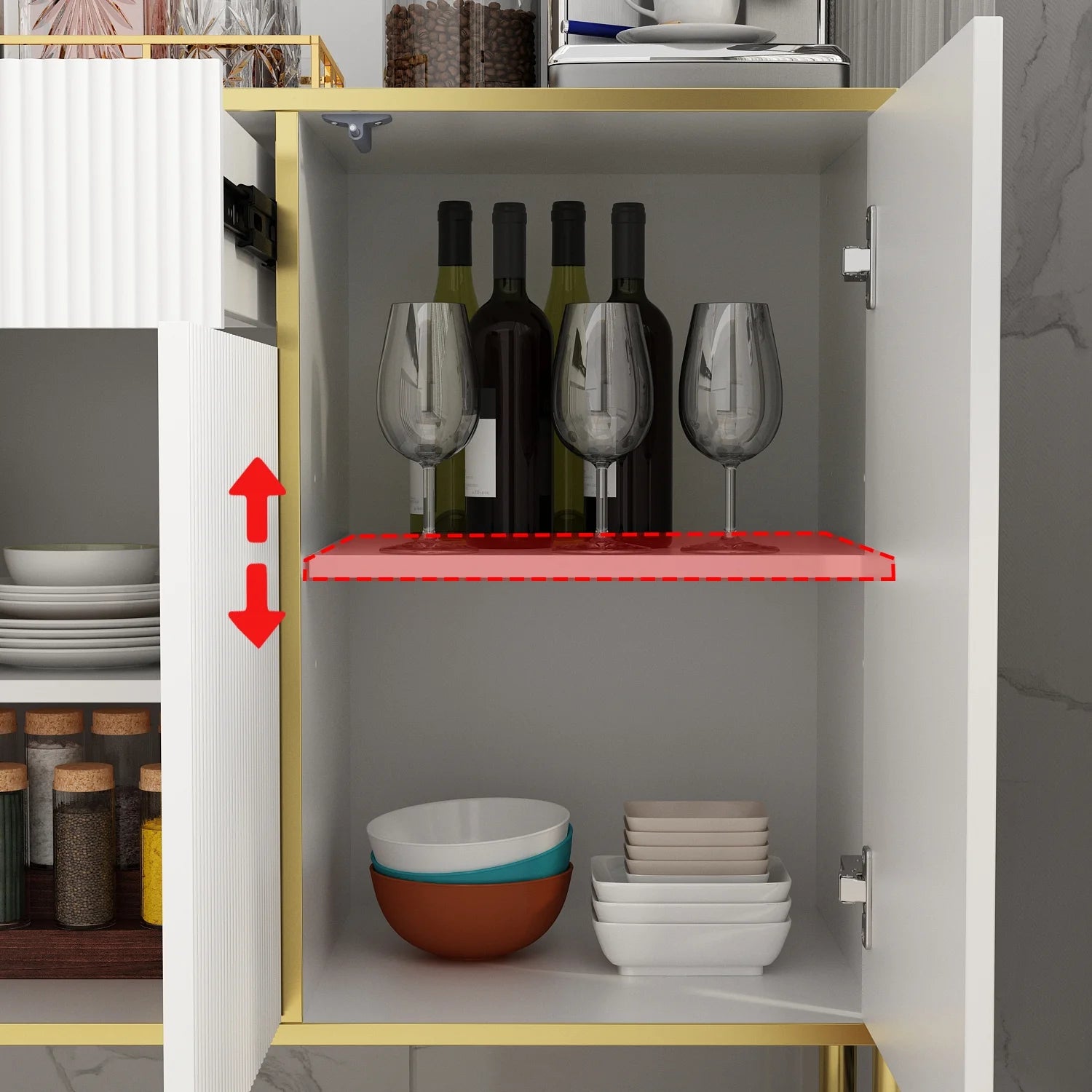 The 4-Door Buffet Cabinet features one large drawer and 3 cabinets with 2-tier shelves inside each, provides abundant space to organize your spices, bowls, plates, containers and so on.The 63 inch wooden top allows you to display your blender, microwave, coffee machine or even small TV set.The credenza sideboard buffet adopts a pop-up design with each drawer and door equipped with a pop-up device, which offers you great convenience and an excellent modern experience. You just need to press it gently, and then it will pop up automatically.The wave-looking surface and steam-lined design offers a unique classy beauty and minimalism for your living space. You’ll feel the exquisite and elegant on the first sight of this modern buffet cabinet.This sideboard cabinet features simple white finish and golden line and the sleek golden metal handle makes it even more attractive.The bottom is equipped with metal legs, which ensure stability, and at the same time increase the sensory impact. This buffet sideboard is more modern and minimalist, is a useful addition to any living space or storage area. It is perfect for not only dinning room use, also for garages, reception room or any office use, organize your place tidy and orderly.