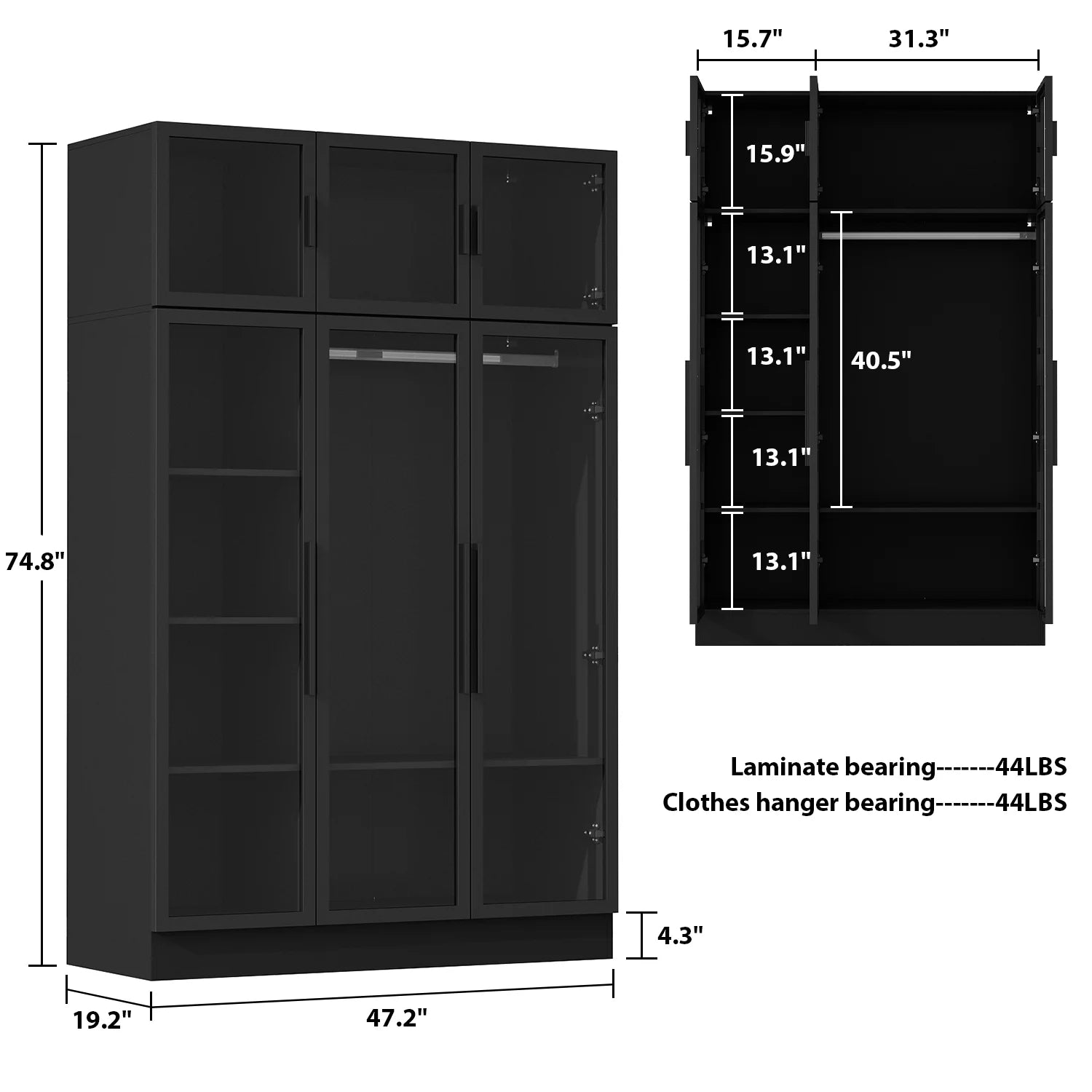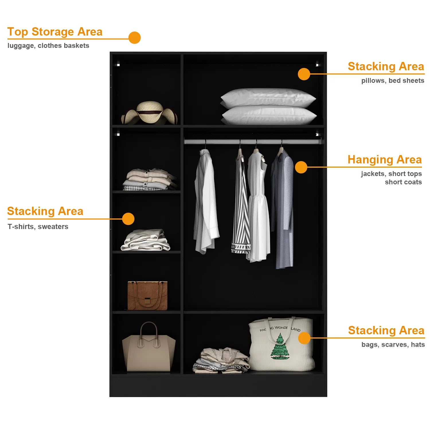 The bedroom wardrobe armoire is made of high-quality MDF and metal frame which ensures stability and durability.