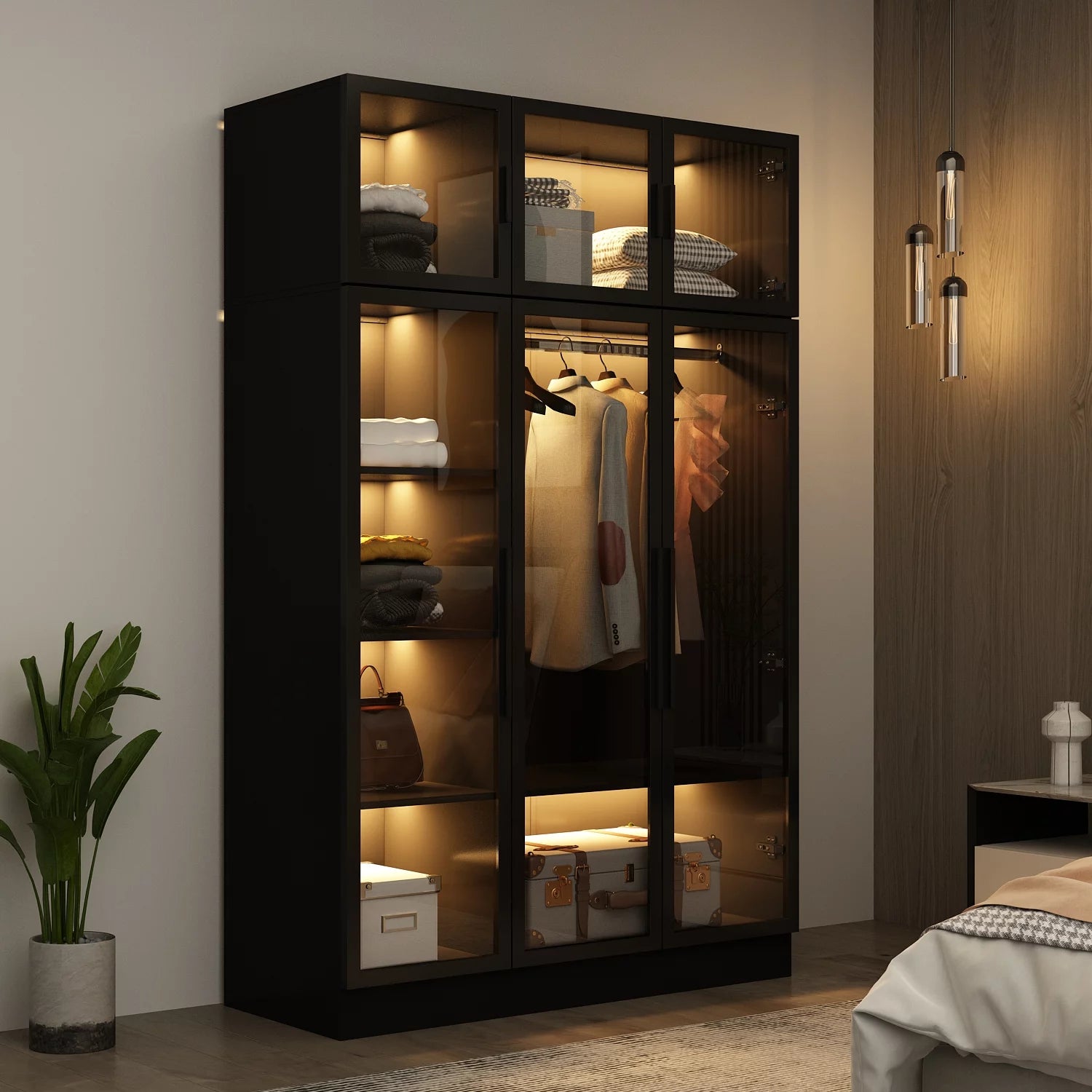 WIAWG Bedroom Wardrobe with Lights, Armoires Closet Storage Cabinet with Hanging Rod and Glass Doors