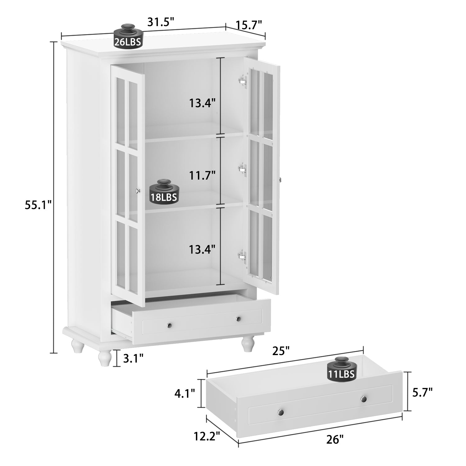 - Simple and elegant view:Simple white body with the transparent glass design on the cabinet door,coupled with the vintage door handle, it blends perfectly together to become a countryside style furniture, adding a touch of fresh to your home.