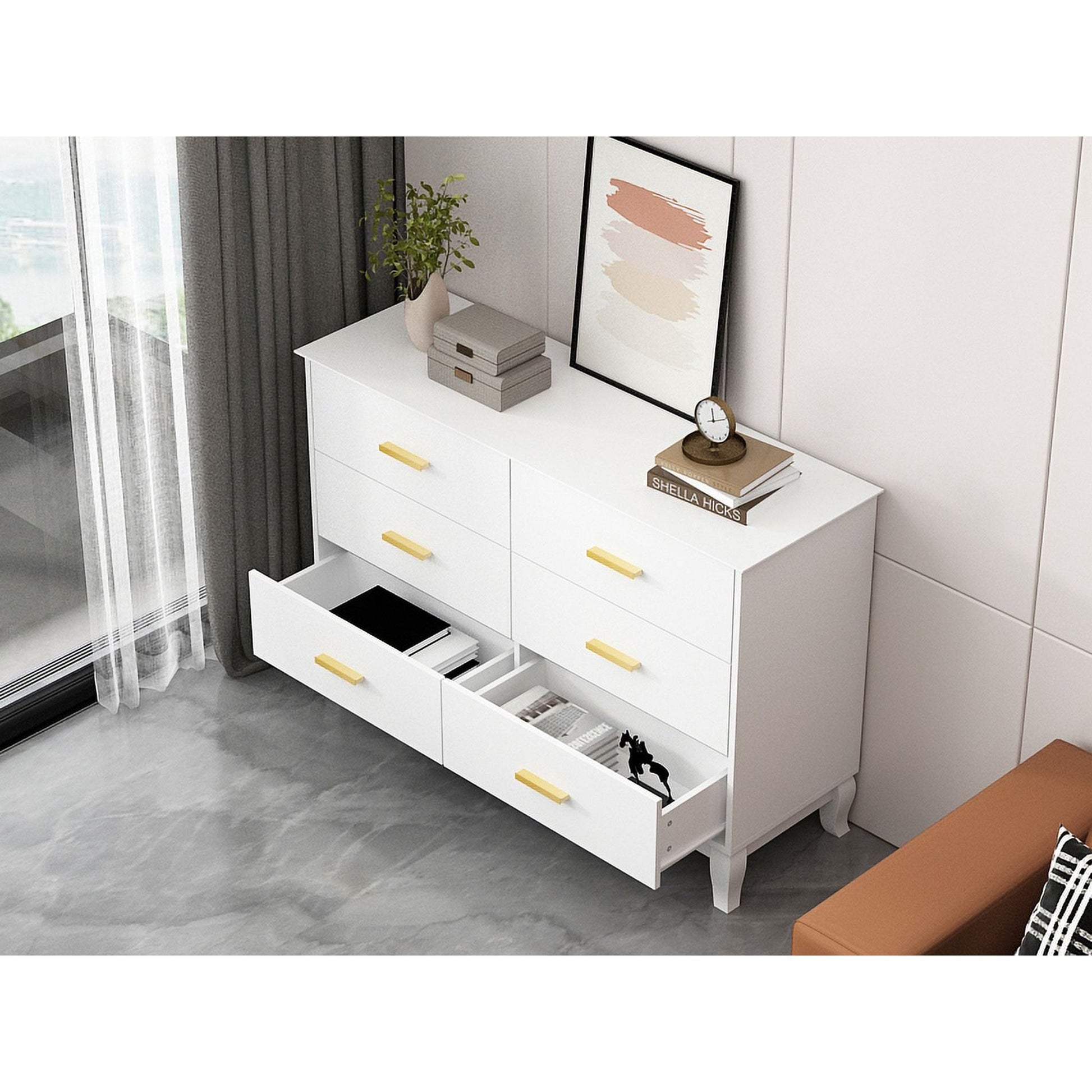 Add extra storage space to your bedroom with this 6-drawer dresser! The dresser is equipped with 6 spacious drawers, providing you with more space to organize clothes and keep your wardrobe free of clutter. You can organize your pants, T-shirts, shirts, and underwear into categories so you know where to find them every morning when you get dressed. If you are looking for an affordable way to modernize your home with modern flair, look no further, this six-drawer storage accent piece will fill the bill! This uniquely designed six-drawer storage chest encompasses modern design by exuding clean lines and a stylish finish.