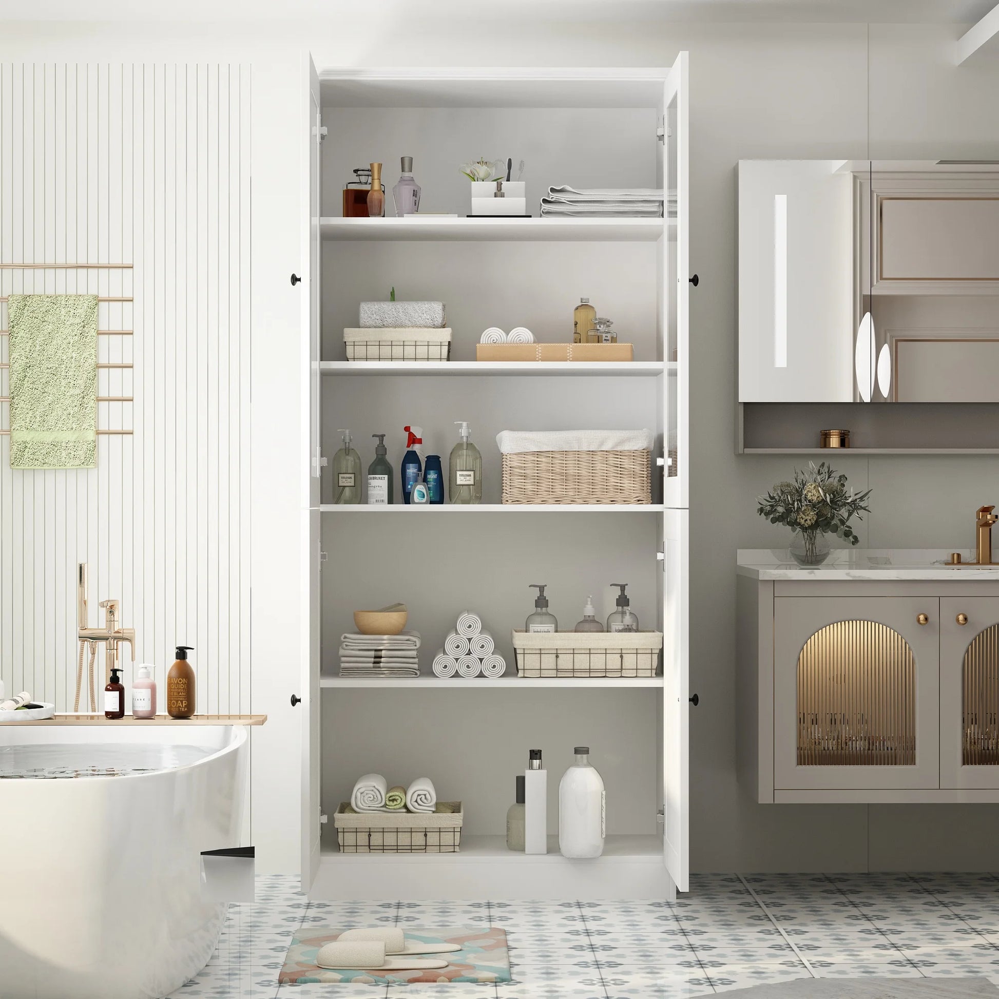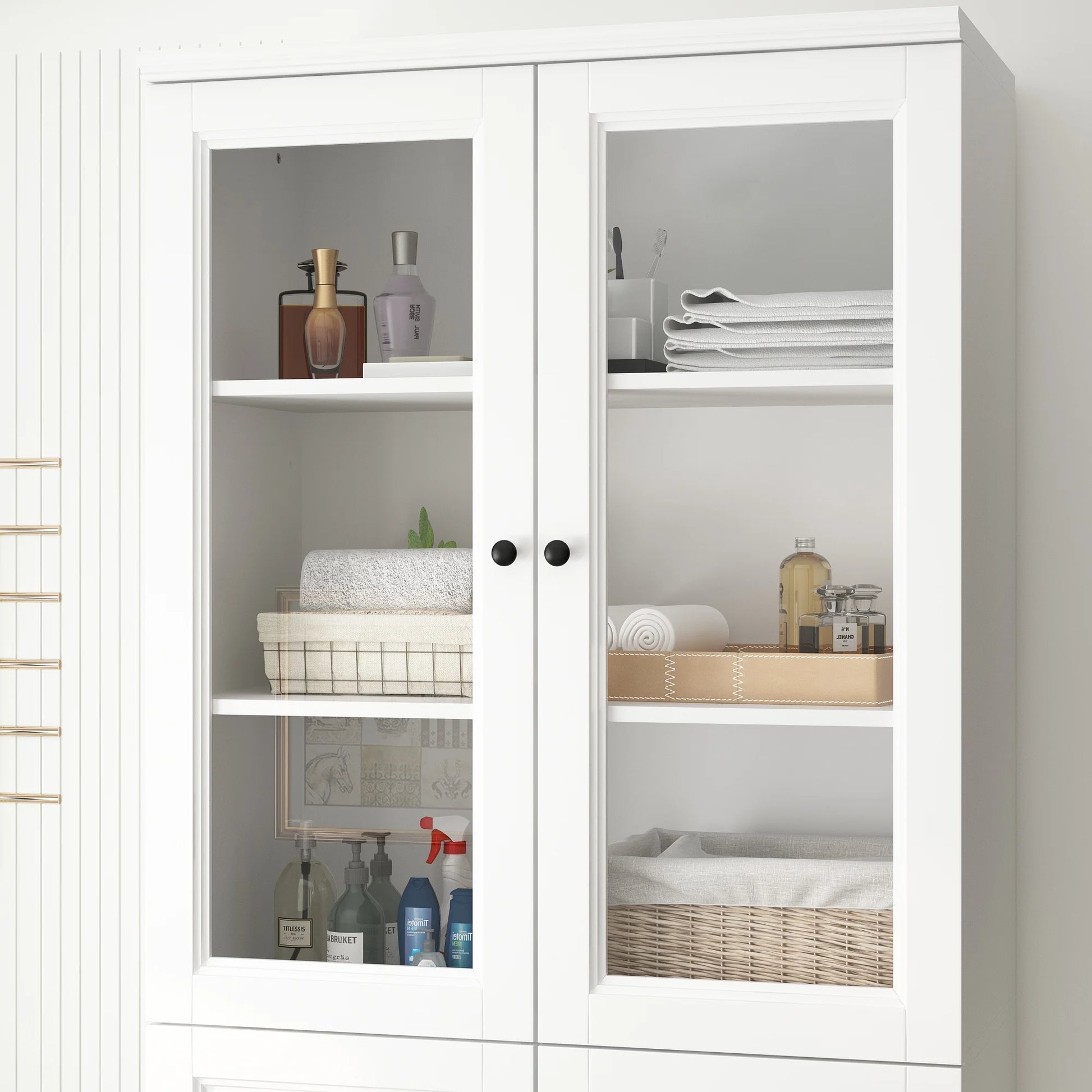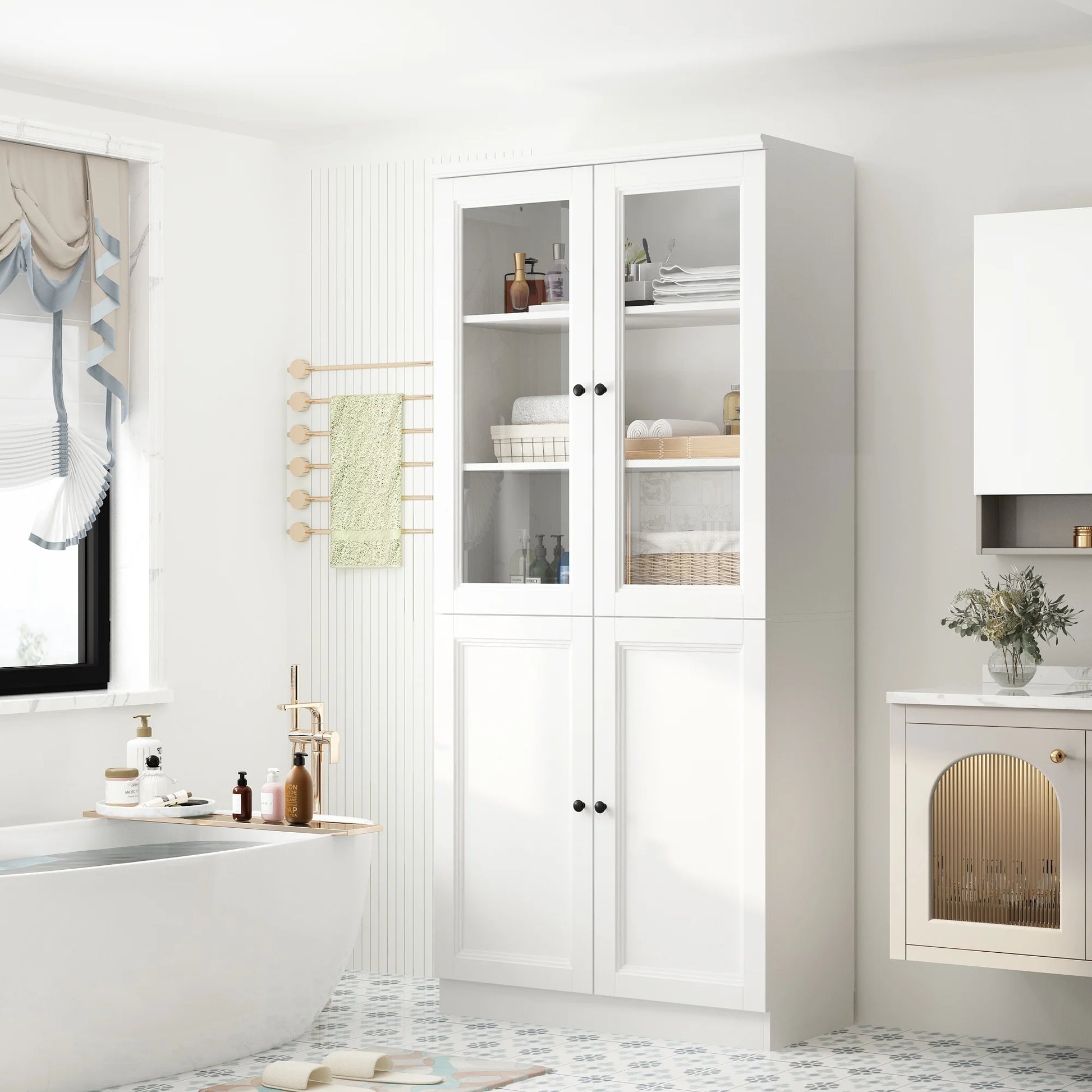 Need more storage in your bathroom? Why not try our white 4-door bathroom storage cabinet with 2 glass doors and adjustable shelves!Keep your towels, toiletries, and other bathroom essentials organized and easily accessible. The glass doors not only add a touch of elegance to your bathroom but also allow you to display your favorite items. The adjustable shelves provide you with the flexibility to customize the cabinet to fit your needs. With its sturdy construction and high-quality materials, this cabinet is built to last. It's easy to assemble and comes with everything you need, so you can have it up and running in no time. Say goodbye to bathroom clutter and hello to stylish storage with our white 4-door bathroom storage cabinet!