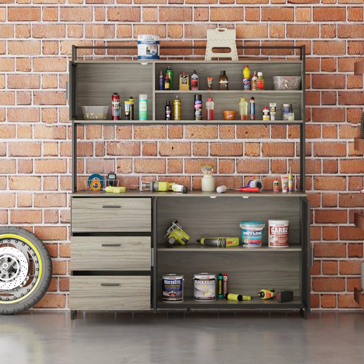 Our large Storage Cabinet is made of particle board and steel, anti-rust and durable, suitable for more places.The Storage Cabinet includes all of the necessary pieces that you need to organize your space. With 3 drawers, closed cabinet and hutch, the tool storage cabinet is great for storing kitchen items, laundry items, tools and anything else that is cluttering your home. You can neatly place maintenance tools, car supplies, etc. in the garage storage cabinet, giving you a clean and tidy garage.It includes all of the hardware for an easy assembly. Use cabinet to save space, keep your room tidy and keep everything organized.The storage cabinet can be easily assembled by following the installation guide provided in the box.