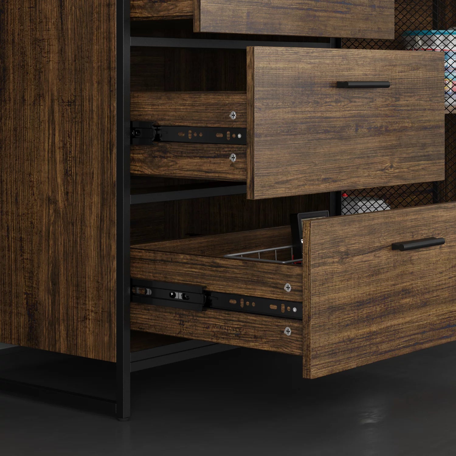 WIAWG Garage Cabinet with 3 Drawers and Metal Mesh Door, Industrial Mutifunctional Tool Storage Cabinet for Warehouse, Basement, Home Office (Walnut)