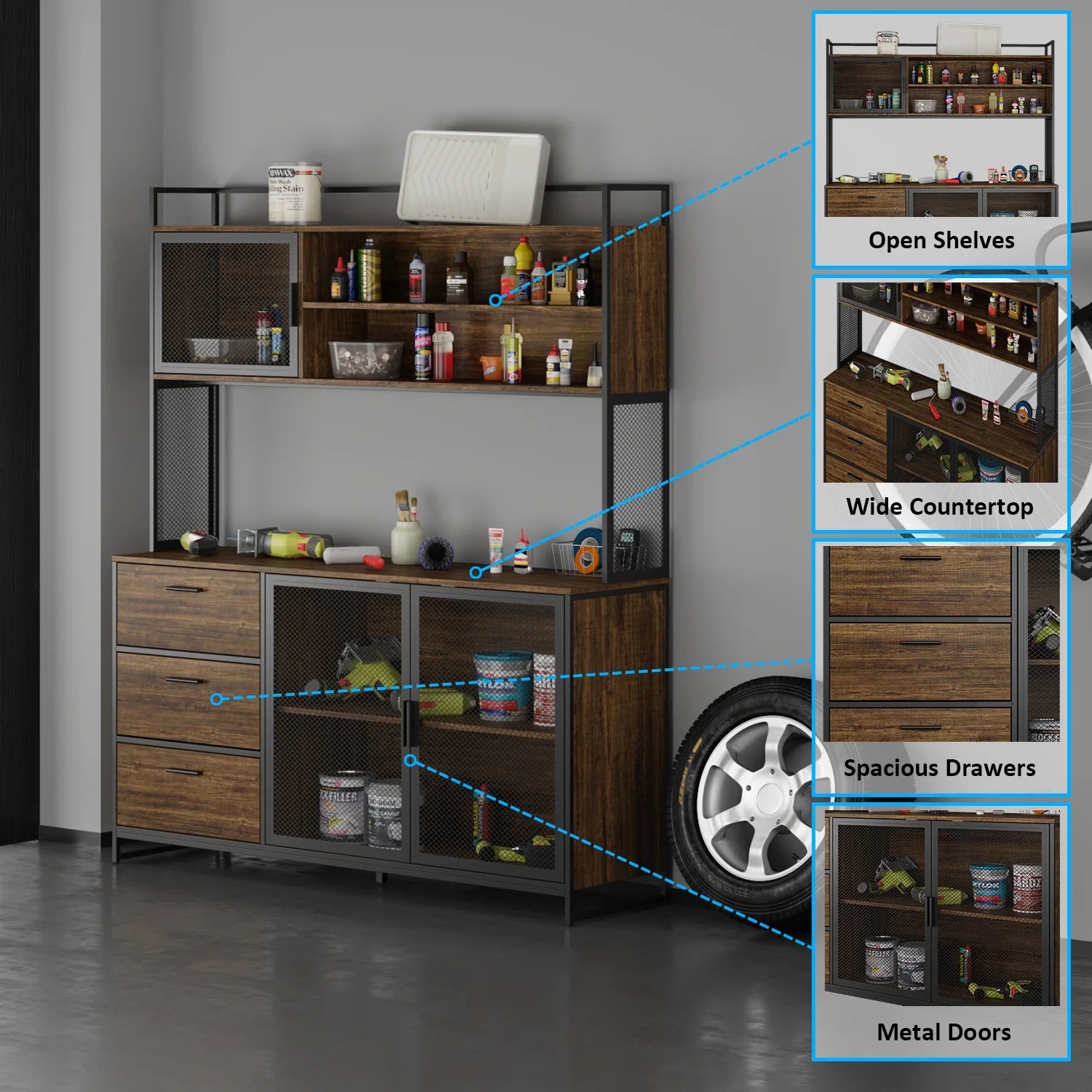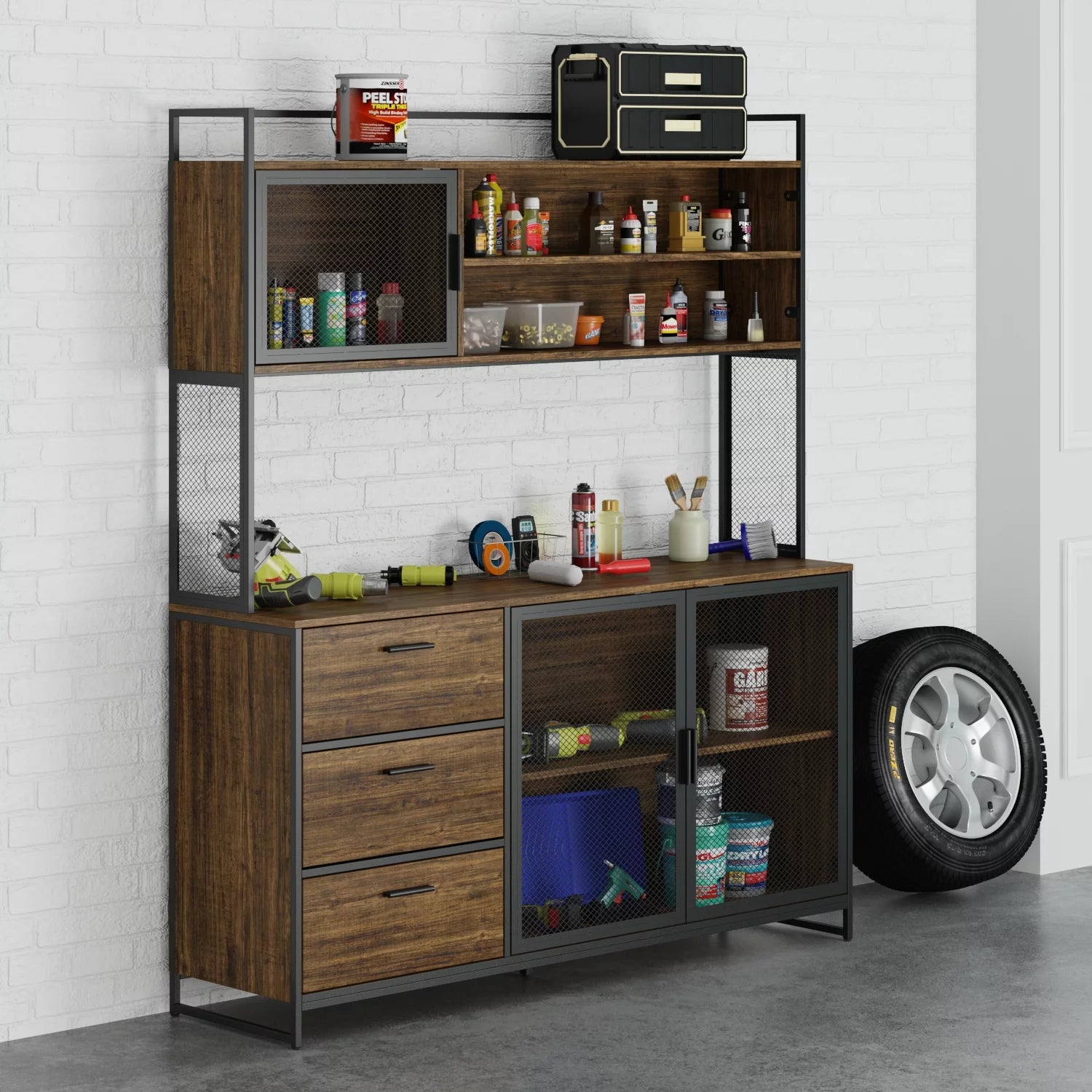 Our large Storage Cabinet is made of particle board and steel, anti-rust and durable, suitable for more places.The Storage Cabinet includes all of the necessary pieces that you need to organize your space. With 3 drawers, closed cabinet and hutch, the tool storage cabinet is great for storing kitchen items, laundry items, tools and anything else that is cluttering your home. You can neatly place maintenance tools, car supplies, etc. in the garage storage cabinet, giving you a clean and tidy garage.It includes all of the hardware for an easy assembly. Use cabinet to save space, keep your room tidy and keep everything organized.The storage cabinet can be easily assembled by following the installation guide provided in the box.