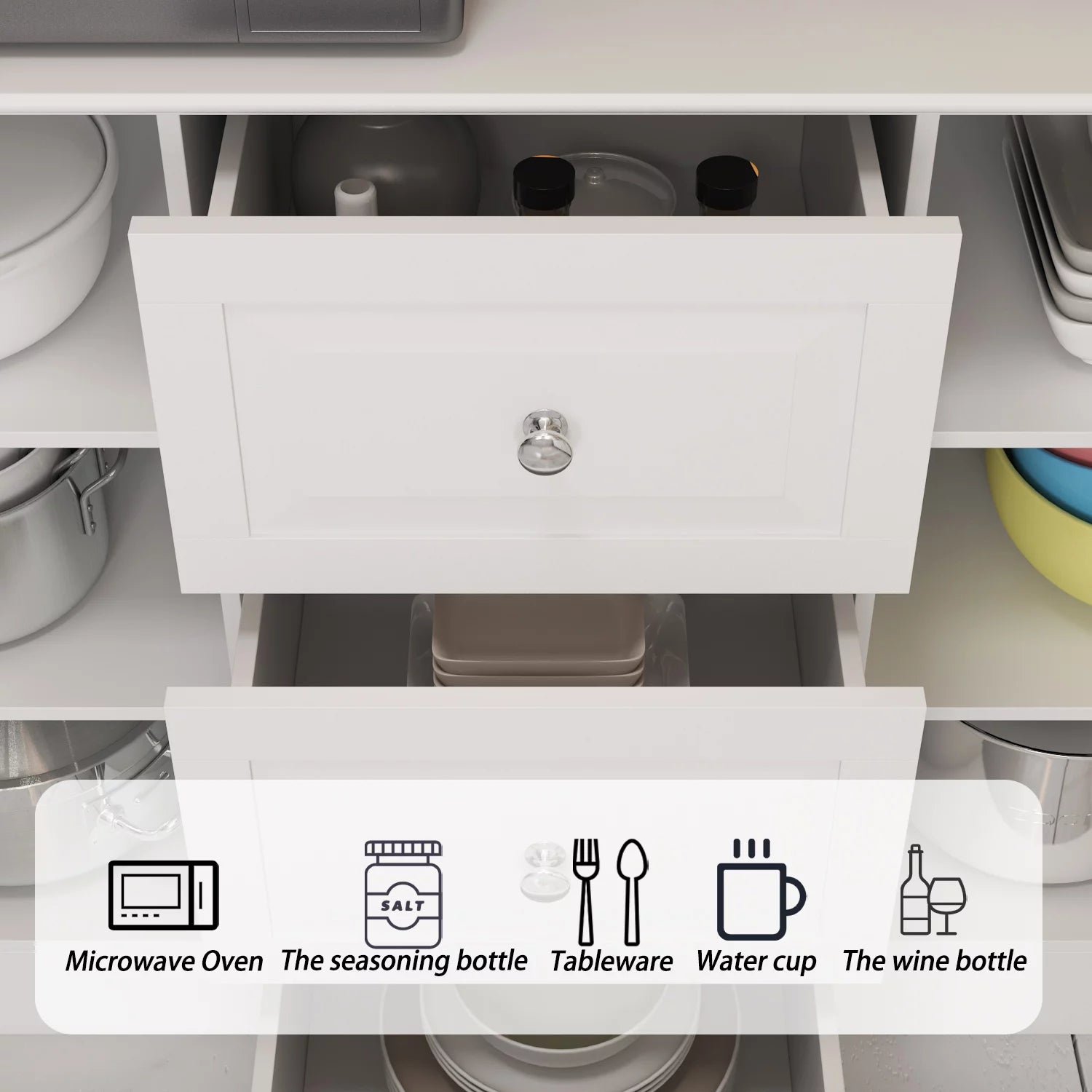 WIAWG Liquor Buffet Bar Cabinet with Glass Door, Kitchen Hutch Cabinet with Drawers, Glass Holder and Wine Rack, White
