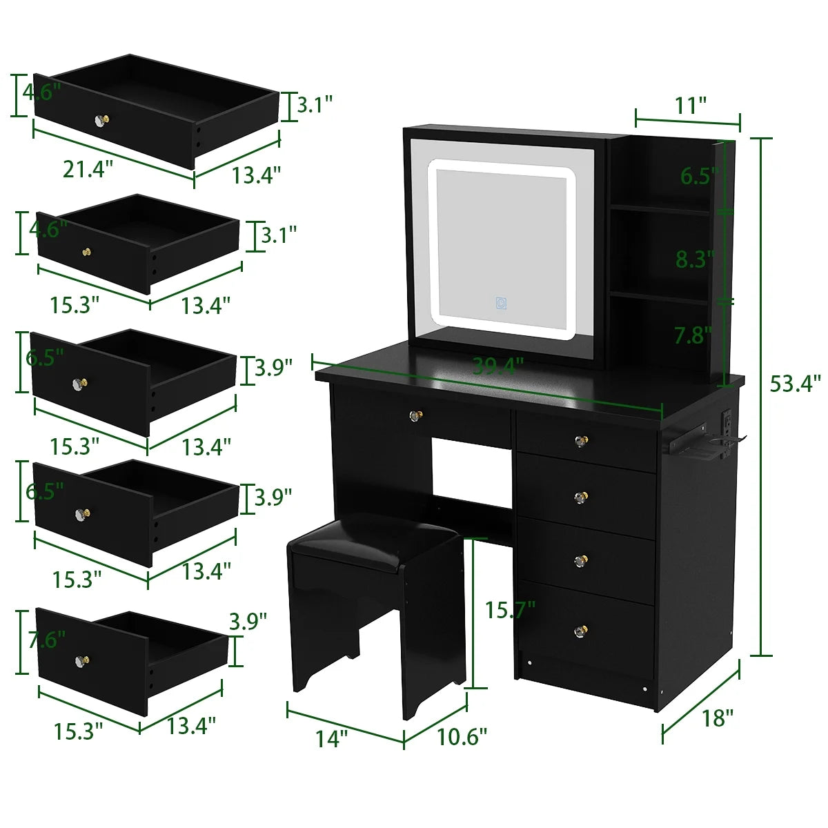 WIAWG Makeup Vanity Table Set with Hair Dryer Holder, Dressing Table with Sliding Lighted Mirror and Charging Station, Black