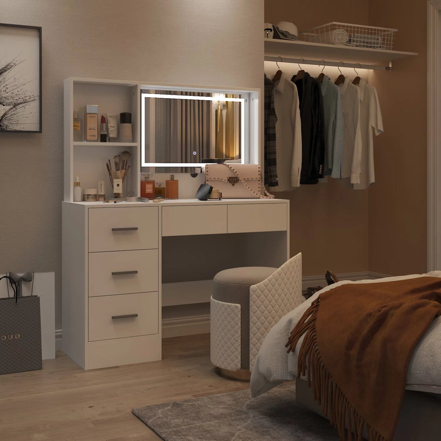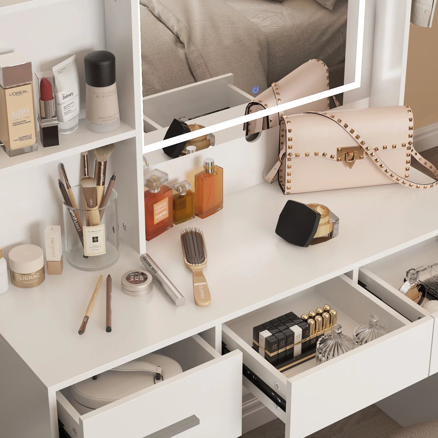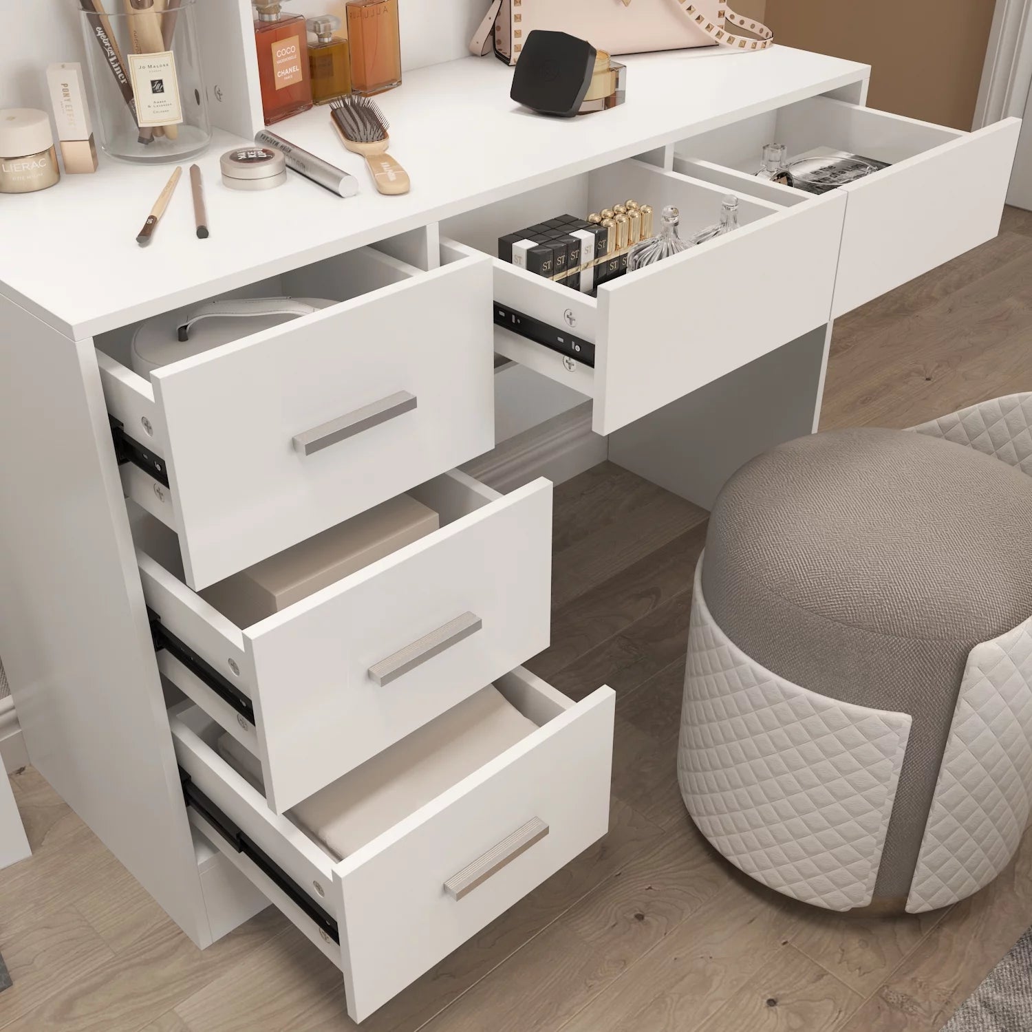 - Featuring 6 drawers and 2 shelves, this vanity desk allows you to store your jewellery and makeup stuff.