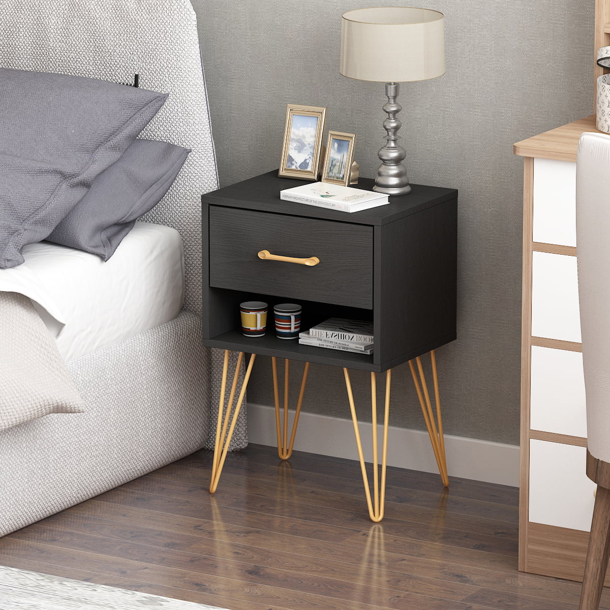 WIAWG Metal Frame Nightstand with Drawer, Modern End Table for Bedroom, Black