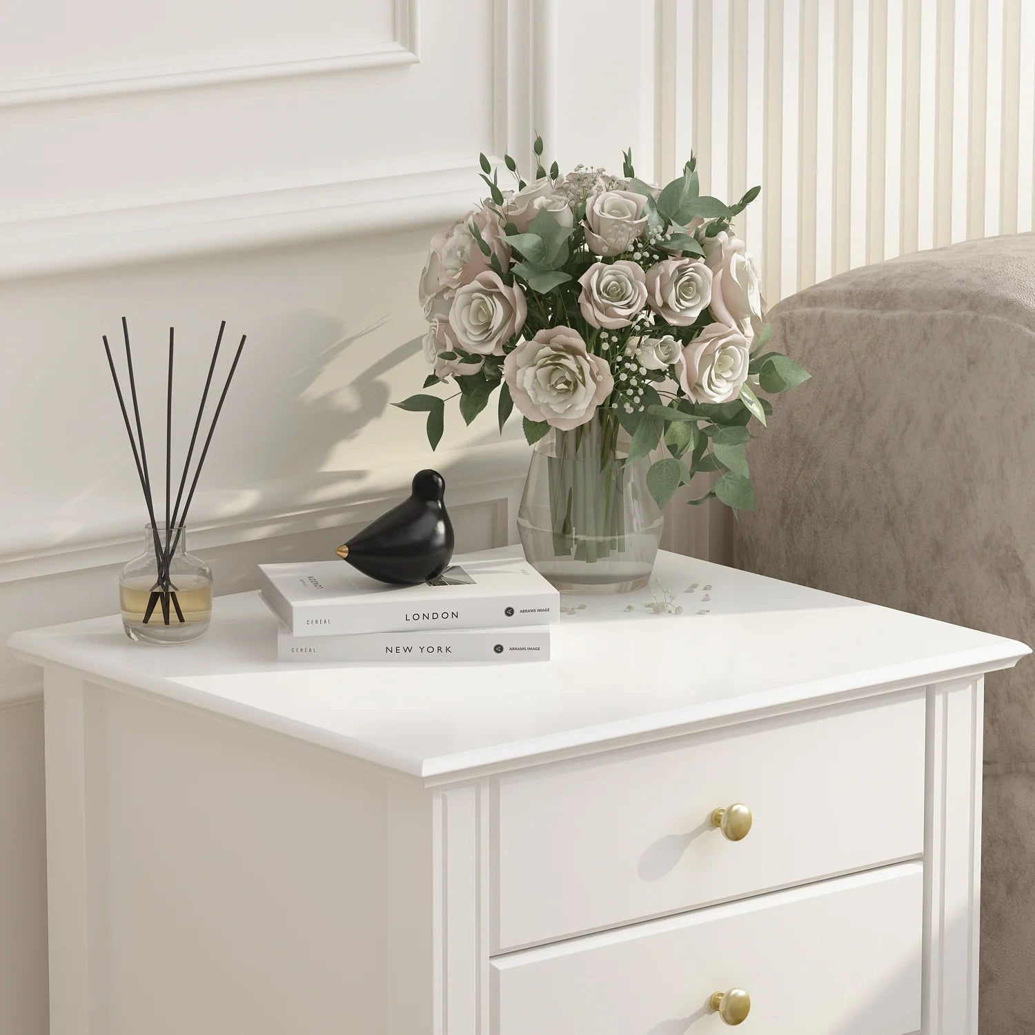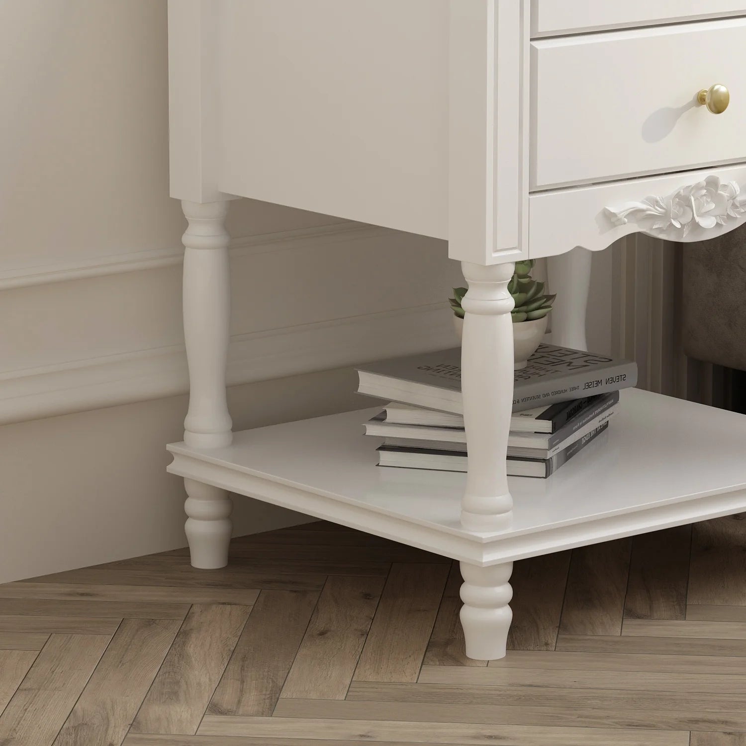 Traditional and contemporary elements work together in the French provincial style nightstand, giving it a timeless elegance. The gorgeous provincial design elements have been delicately restored and finished with a rustic iron handle and white finish. This bedside table with two drawers and one shelf works beautifully as a side table in the living, entry, hallway, in addition to the bedroom. The neat proportions of this 2 drawers bedside table make it a functional piece for smaller spaces. The meticulously carved French fluted legs and corners and the frame details are paired beautifully with a classics white finish, giving a traditional style table a chic twist. It requires assembly.