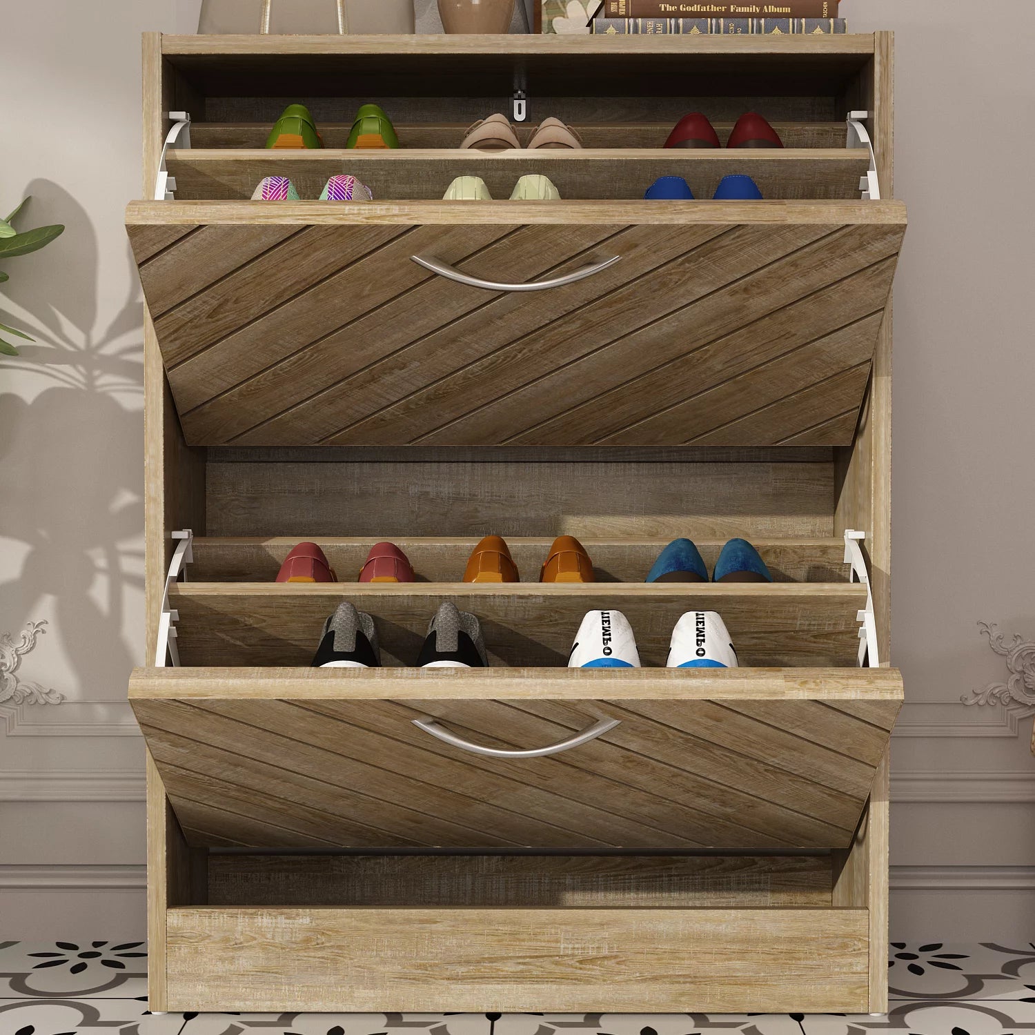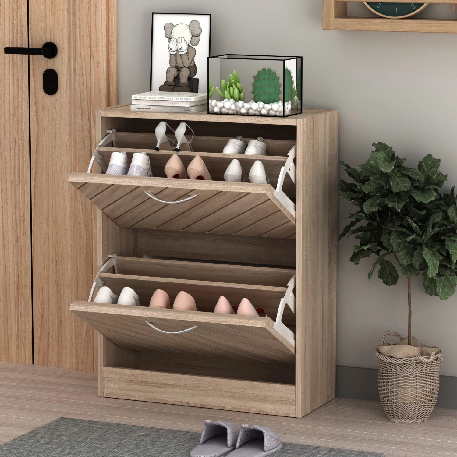 - With 2 foldable compartments, the shoe storage cabinet will help you deal with the mess in your entryway. Each compartment holds two row of shoes, which can effectively hold many sizes of shoes. This shoe organizer also provides a flat surface on top, give you options to use it as a tabletop for decor.