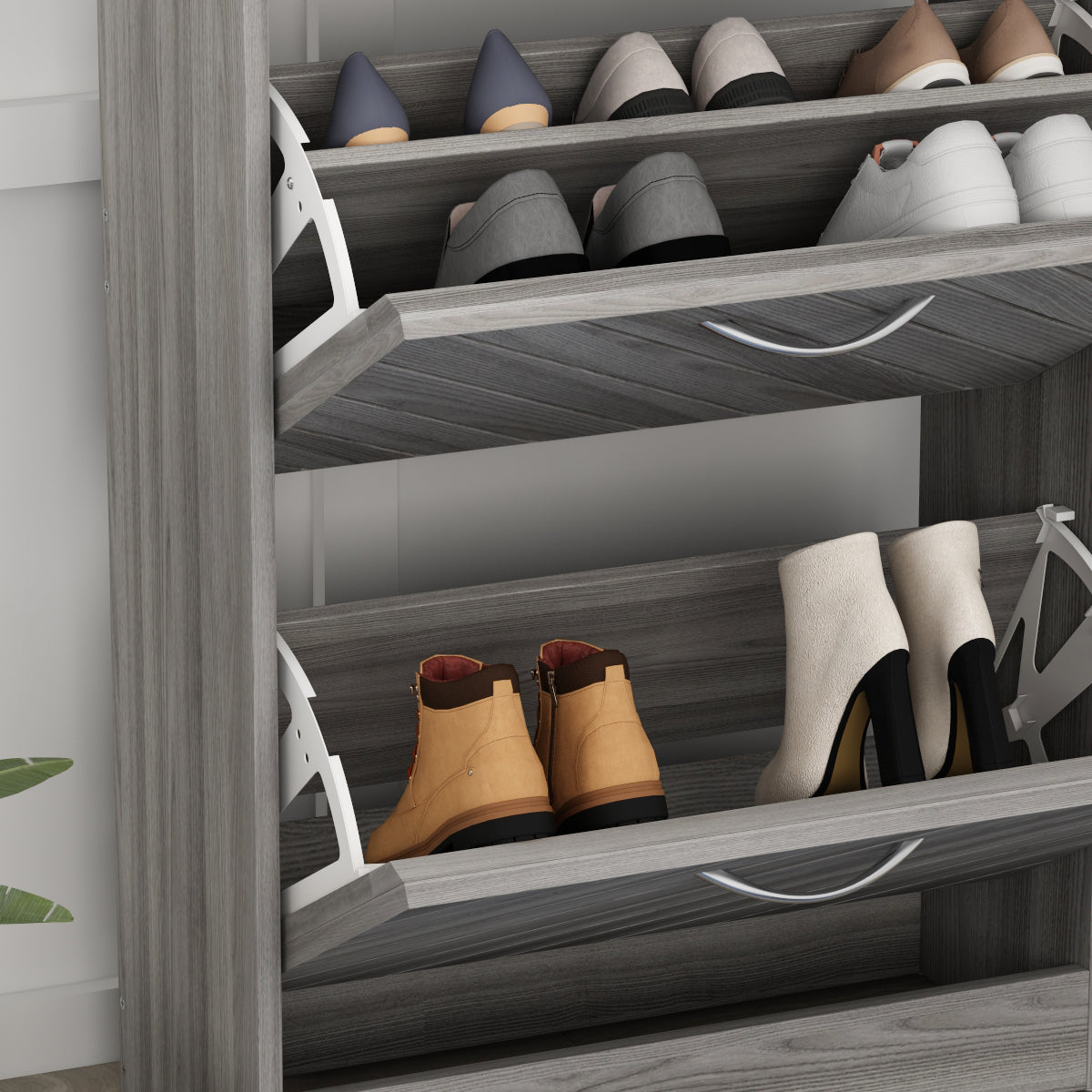 - Three tilt-out doors conceal shoe storage compartments