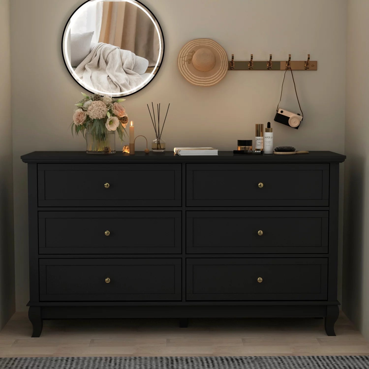The 6 drawer dresser is made of high quality MDF board, the spray painting process makes surface smooth and delicate, which also prolongs service life, ensures stability and durability. Features 6 wide spacious drawers with gold metal handles, the dimension of each is 20.66 x 13.38 x 4.72 inch. The large wooden top allows you to display decorations, photo albums, potted plants and so on. The wooden legs effectively support the entire weight, you can easily clean off the ground.The classic curved wooden legs brings a high-end level, the wood dresser would be perfect for your bedroom or any other living space as home decor.