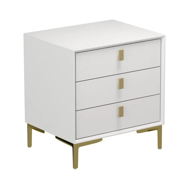 The nightstand with drawers is combined premium MDF with golden metal base which ensures durability and stability for long-term use. Boasting 3 glide drawers which offer an amount of hidden closed space for your private items and daily sundries to help keep rooms tidy and organized. Otherwise, the spacious top surface provides open storage for your bedtime essentials within arm's reach. Show off your stylish taste and bring a perfect addition of storage solution to your home.