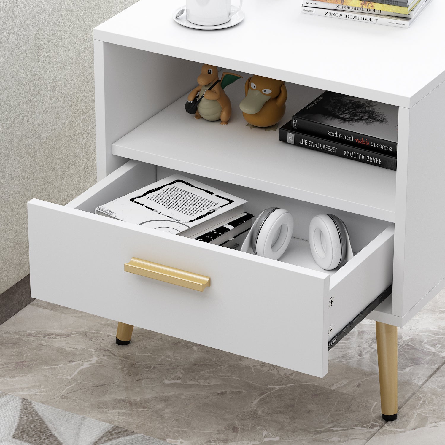 With its perfect combination of style and storage, this 2-drawer nightstand is a must-have for bedrooms of all styles. It's made from engineered wood with veneers and finished in your choice of a white or acorn hue. In addition to its 1 drawer and expansive rectangular tabletop, it has an open shelf that is perfect for keeping books organized or storing remotes, if that's more your style. It has gold handles for a touch of on-trend contrast.