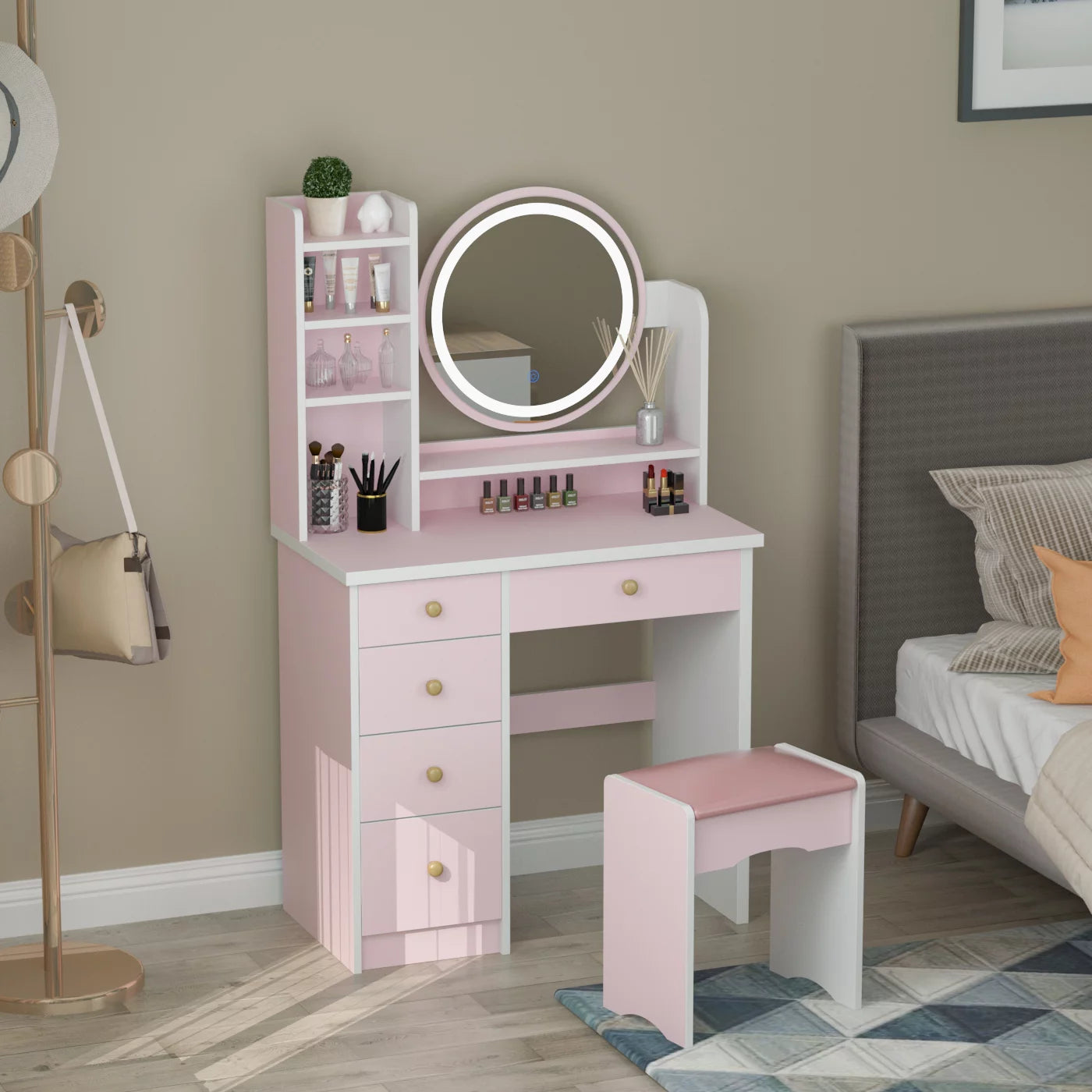 WIAWG Modern Vanity Set With Mirror Make up Table with Built-in 3 Color LED Light Pink