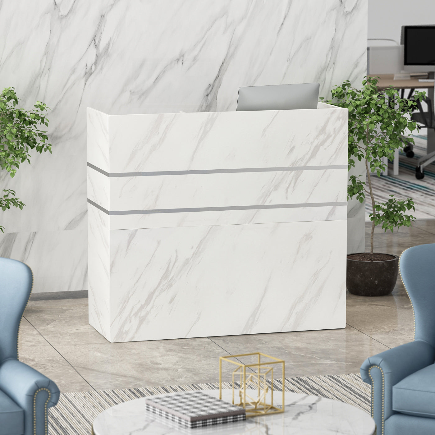 - Whether you are looking for a front desk for an office, salon, hotel, or any other workplace, this marble white reception desk is the right choice! Designed to enhance the aesthetics of your workspace, this beautifully crafted and modern reception desk will make a great first impression on your clients.