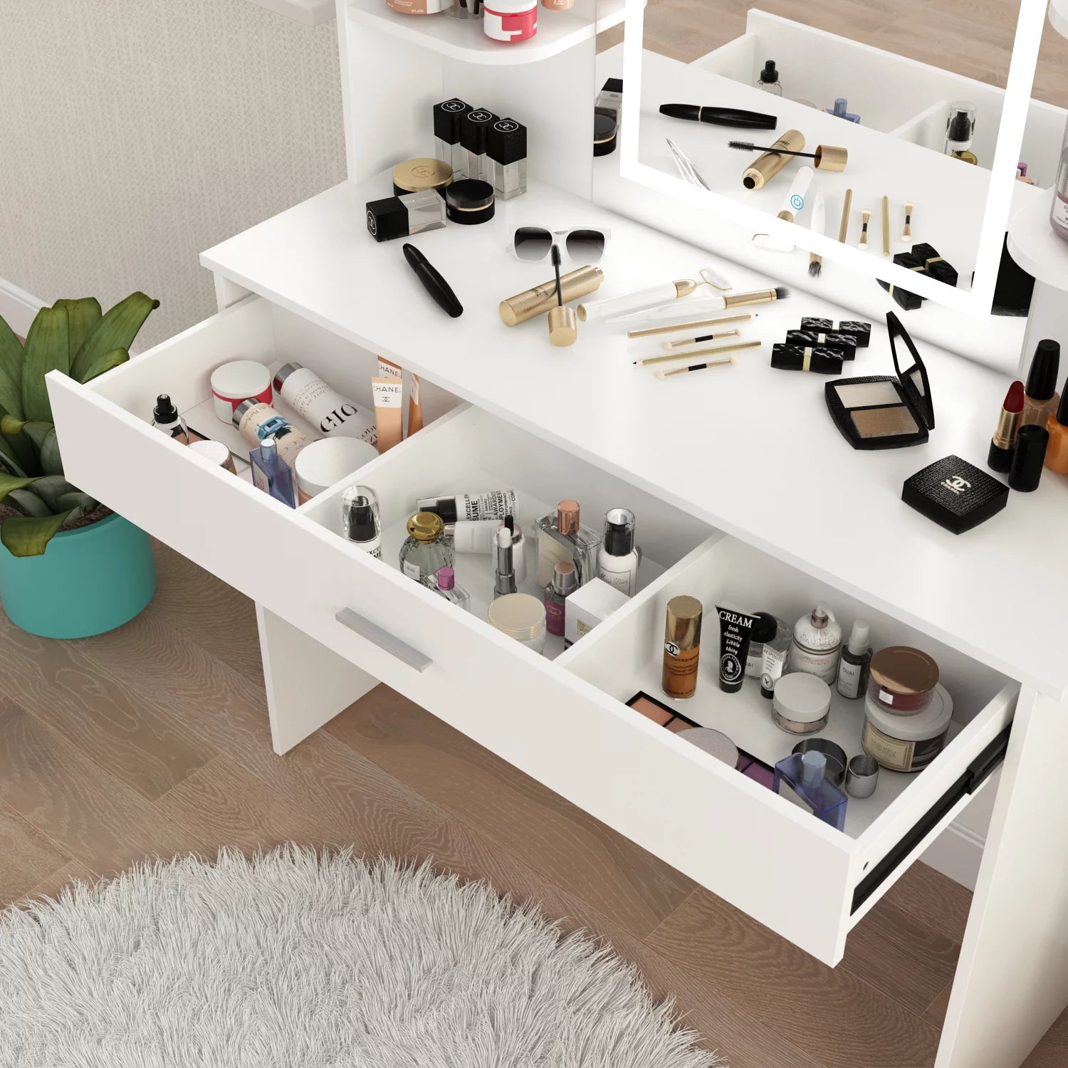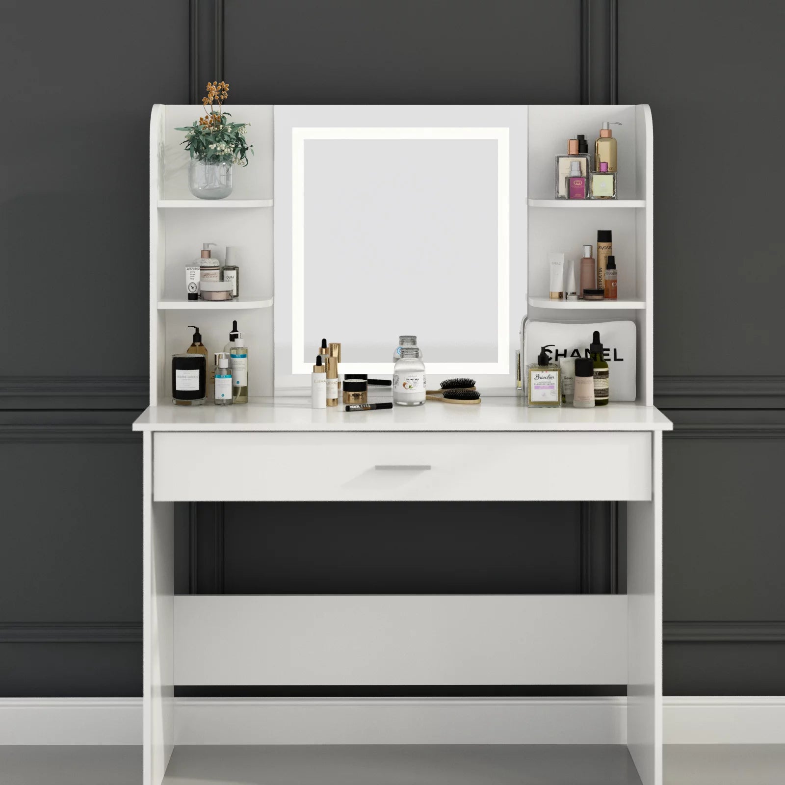 WIAWG Vanity Set with LED Lighted Mirror, Makeup Table Dressing Desk with Storage Shelves and Drawer for Bedroom